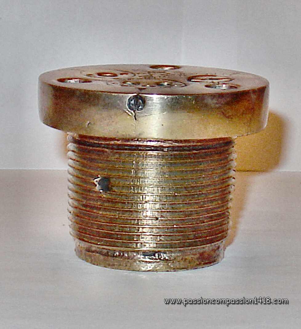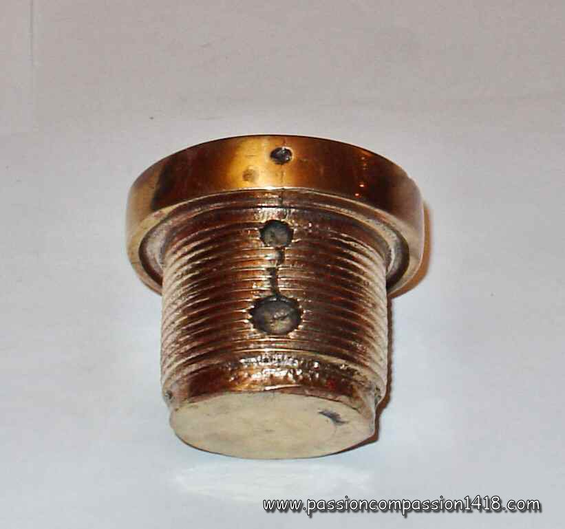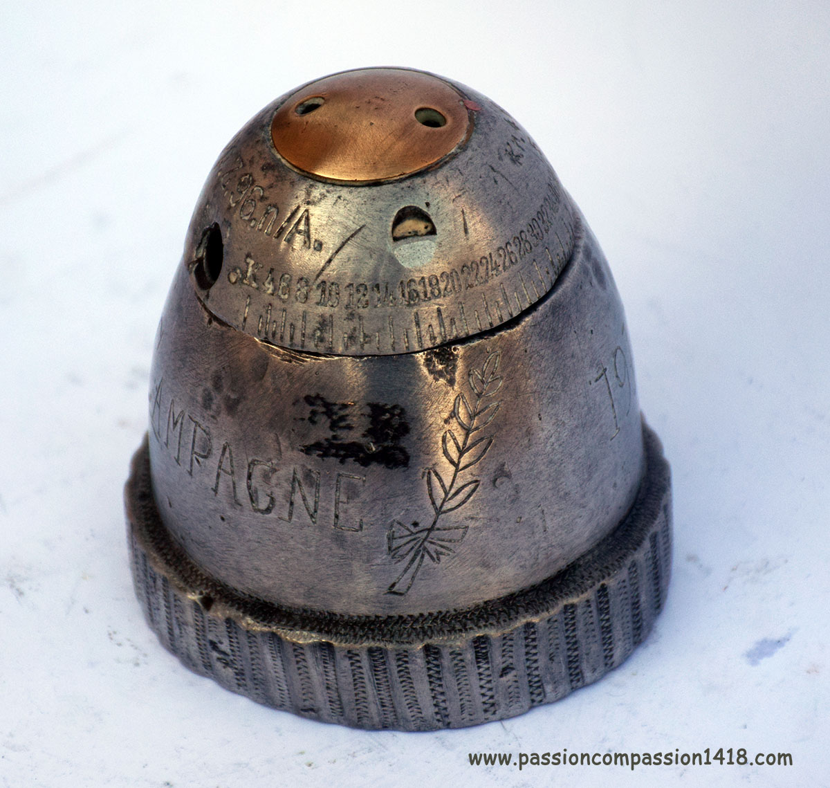 Le culot est recouvert d'une feuille de laiton (probablement prélevée sur une douille) et gravée de deux formes d'obus.