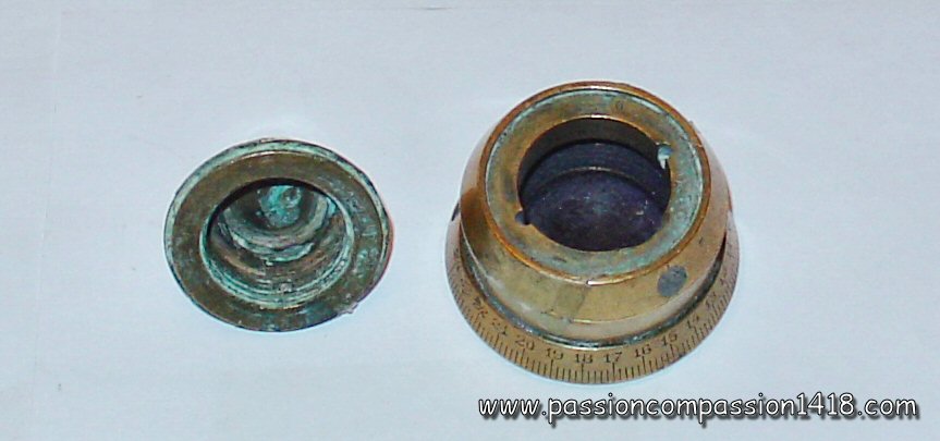 L'une des deux balles (la plus sombre) semble pleine. Elle est un peu corrodée et ne peut être ôtée. L'autre est amovible et ne comporte plus que la chemise évidée de son noyau. Elle pouvait accueillir une plume à encre.