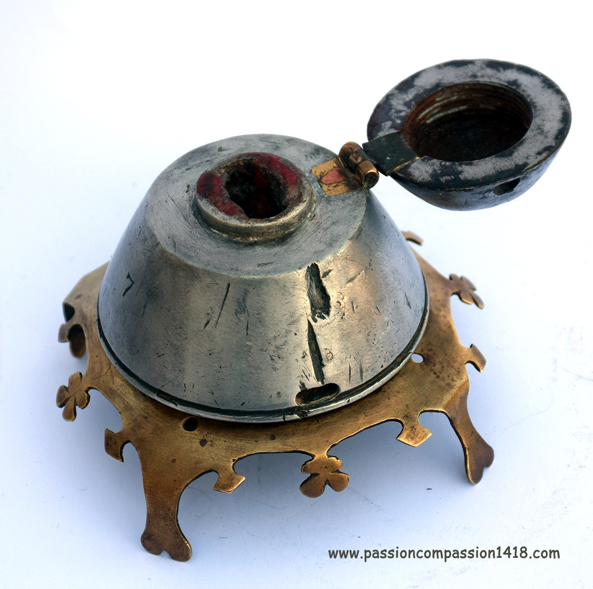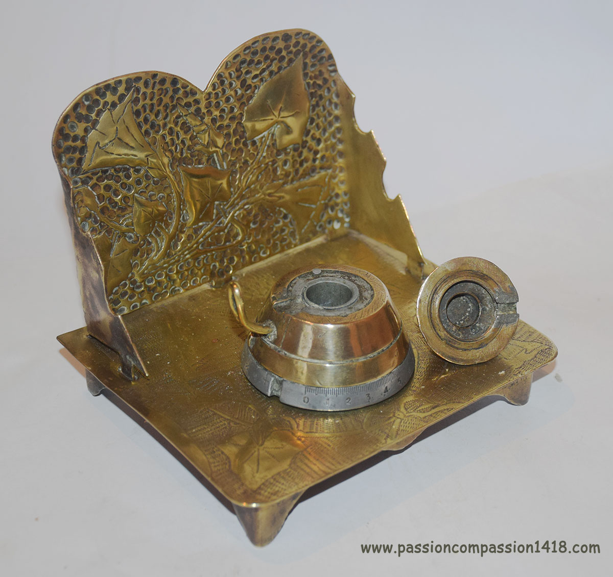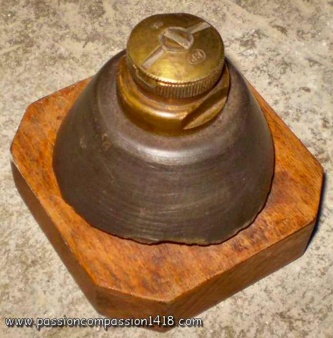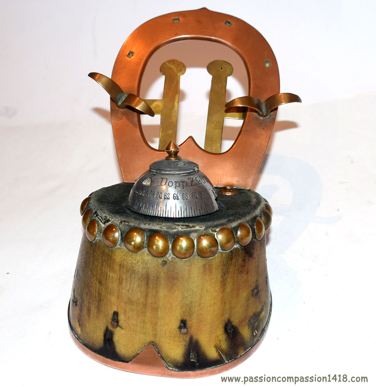 Cet encrier particulièrement original utilise le sabot d'un cheval (conférant à l'ensemble une connotaion un peu sinistre...), orné de clous en cuivre et ferré du le même métal, comme socle pour un encrier fabriqué avec la partie fixe d'une fusée à double effet allemande Dopp Z 96 n/A