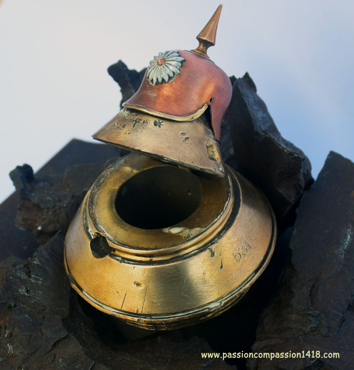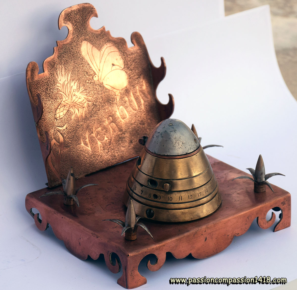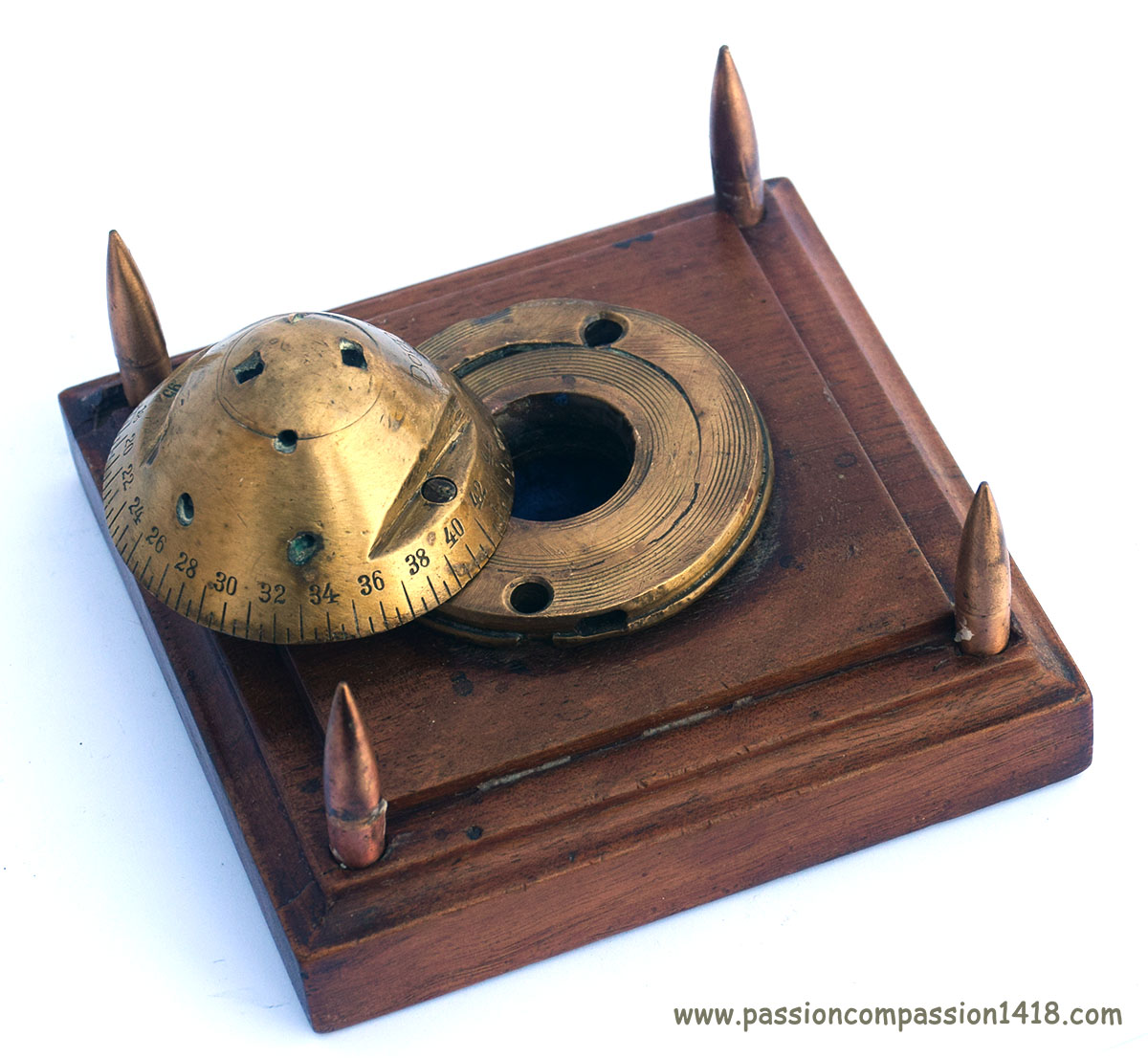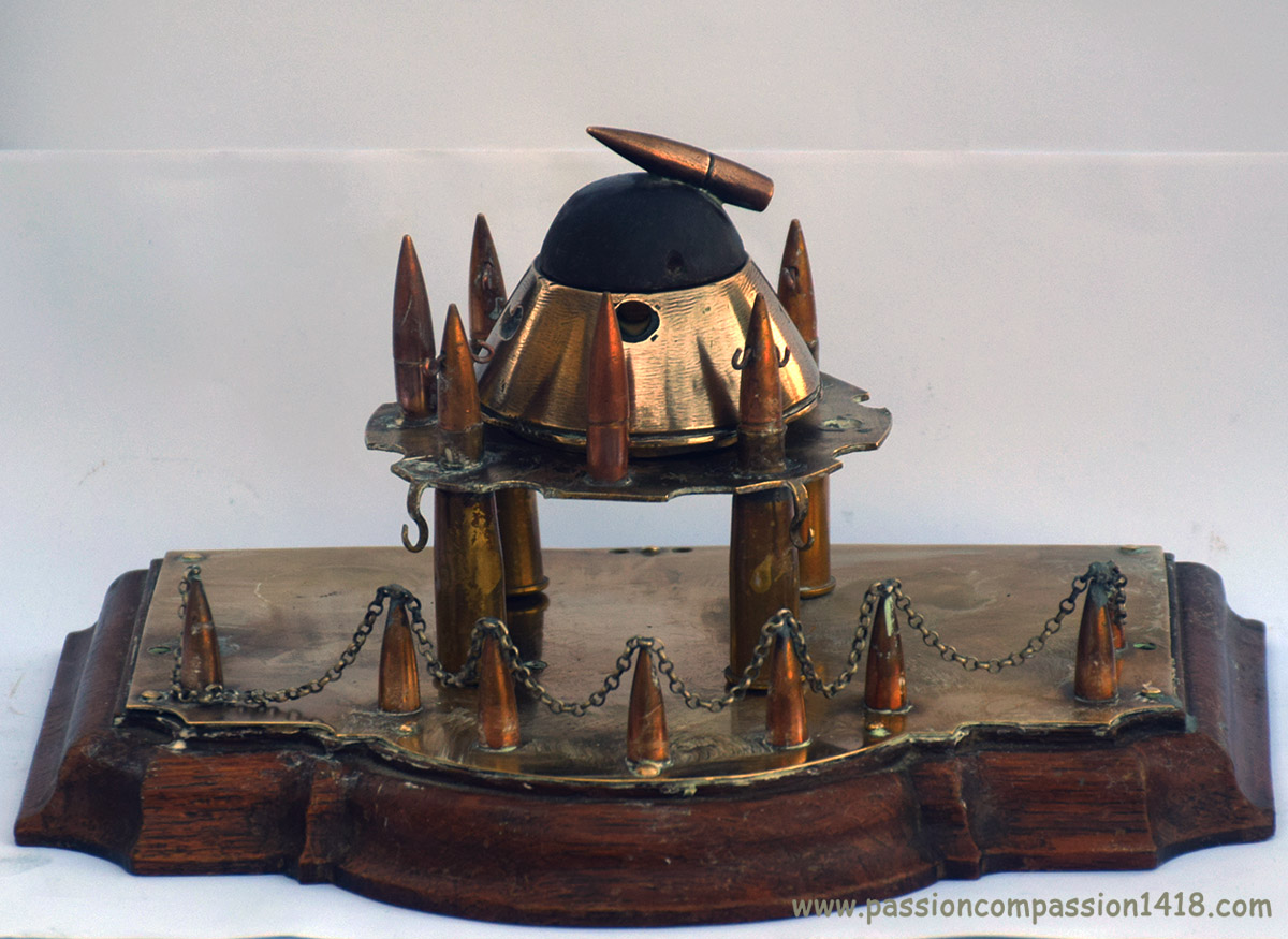 Encrier réalisé avec la partie supérieure d'une fusée allemande à double effet HZ 05 Gr, du culot d'un obus à balles à charge arrière de 7.7 cm également allemand, reconnaissable à sa chambre creuse, ses gorges de sertissage, et d'une ceinture de cuivre d'un obus probablement non tiré (absence de stries) et de fort calibre, formé en fer à cheval et garni de pointes.