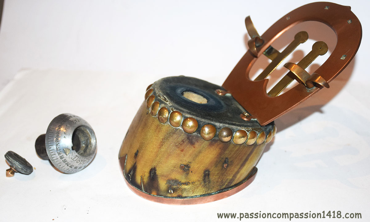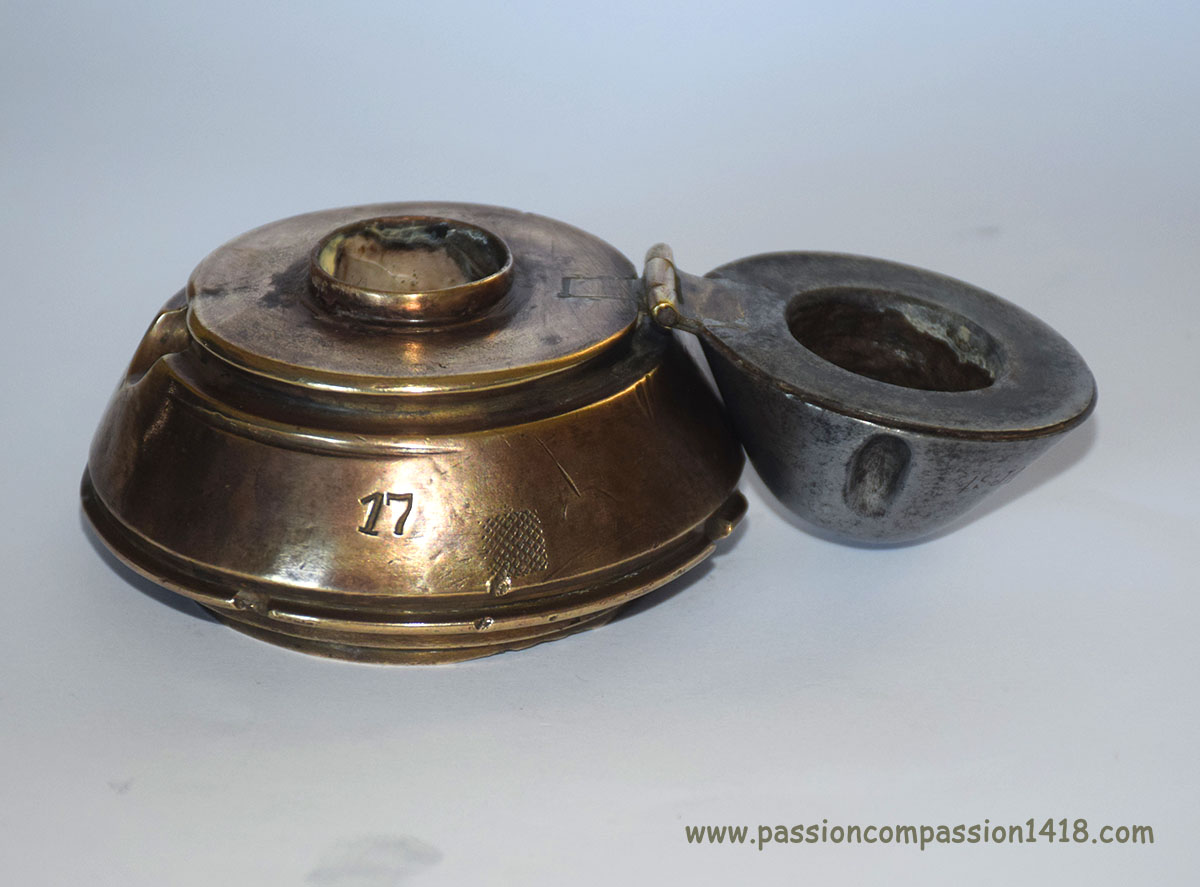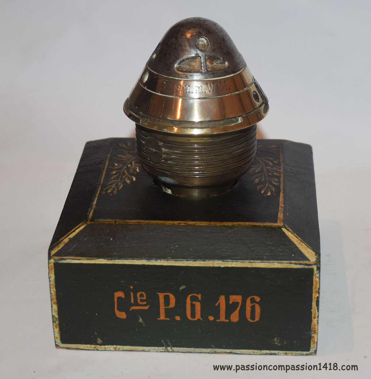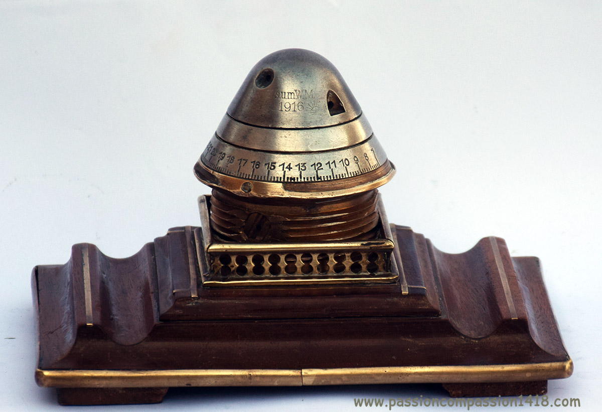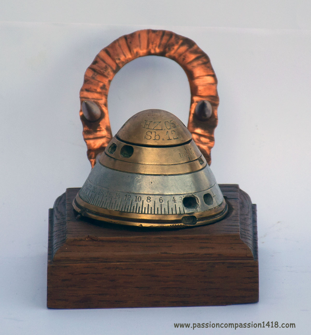 Encrier réalisé avec la partie supérieure d'une fusée allemande à double effet HZ 05 Gr, du culot d'un obus à balles à charge arrière de 7.7 cm également allemand, reconnaissable à sa chambre creuse, ses gorges de sertissage, et d'une ceinture de cuivre d'un obus probablement non tiré (absence de stries) et de fort calibre, formé en fer à cheval et garni de pointes.