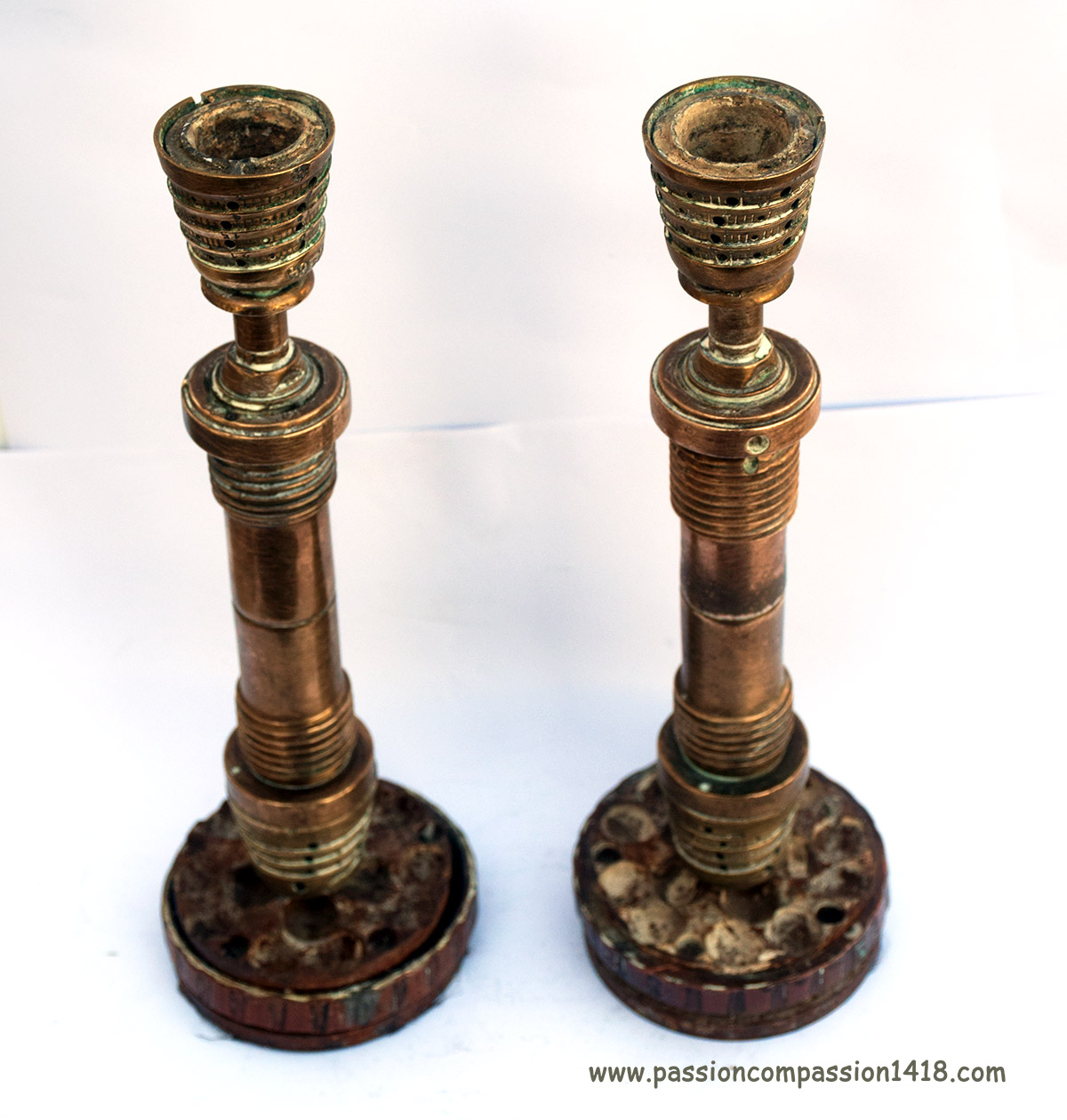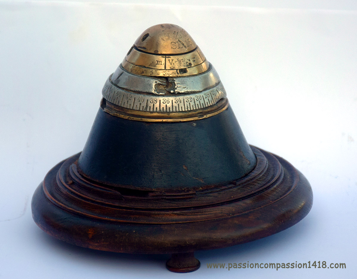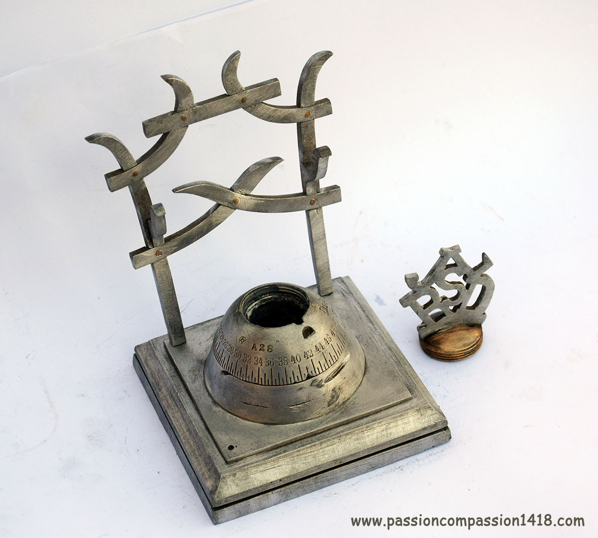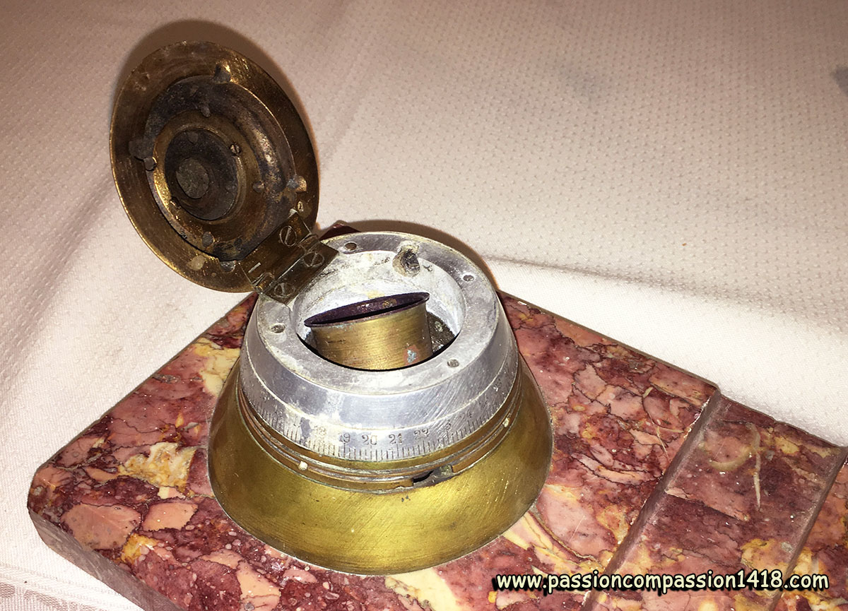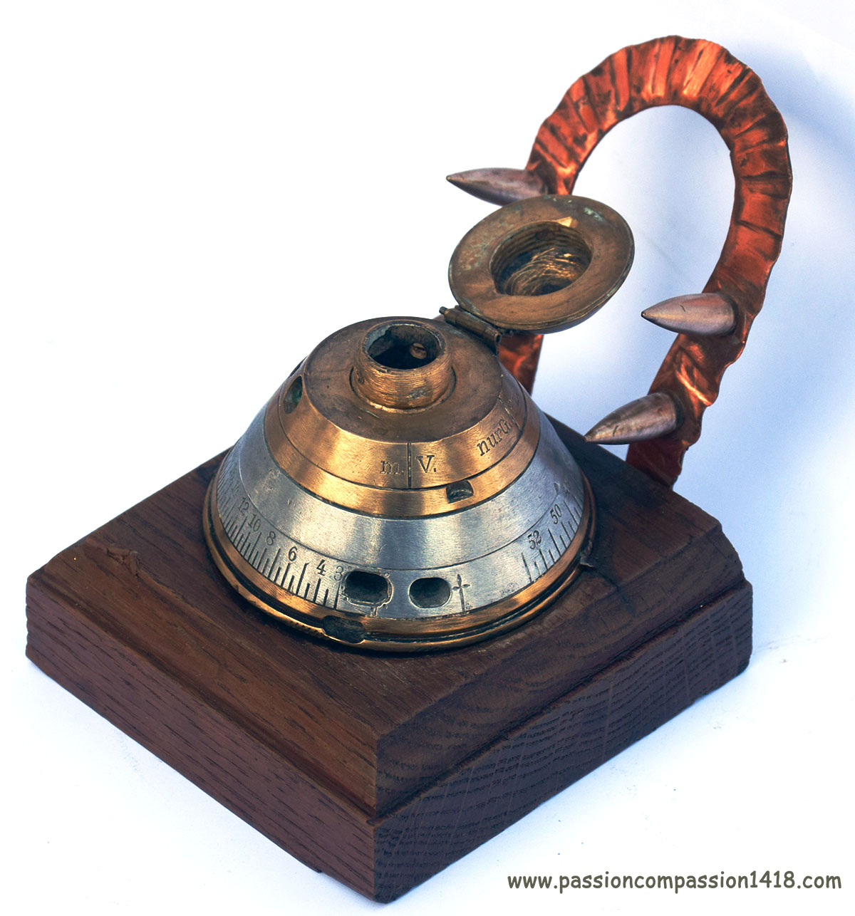 Encrier réalisé avec la partie supérieure d'une fusée allemande à double effet HZ 05 Gr, du culot d'un obus à balles à charge arrière de 7.7 cm également allemand, reconnaissable à sa chambre creuse, ses gorges de sertissage, et d'une ceinture de cuivre d'un obus probablement non tiré (absence de stries) et de fort calibre, formé en fer à cheval et garni de pointes.
