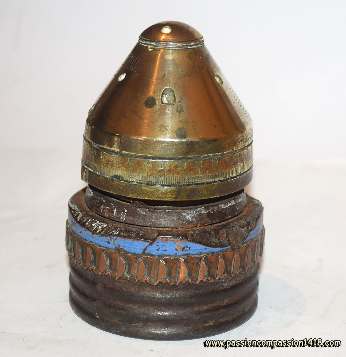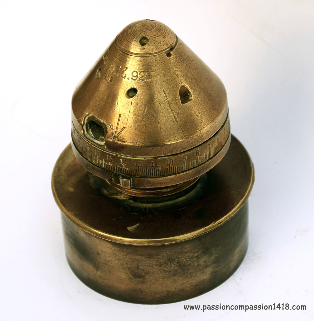Il est impossible que ce trophée date de la guerre Franco-Prussienne de 1870-1871 puisque cette antique fusée fusante Schr Z c/73 allemande est d'un modèle conçu en 1873 complètement obsolète en 1914. Peut-être fut-elle utilisée en 1914-1918 avec de vieux stocks d'obus et ramassée sur un champ de bataille ? Ou bien s'agit-il d'un souvenir d'avant guerre ?