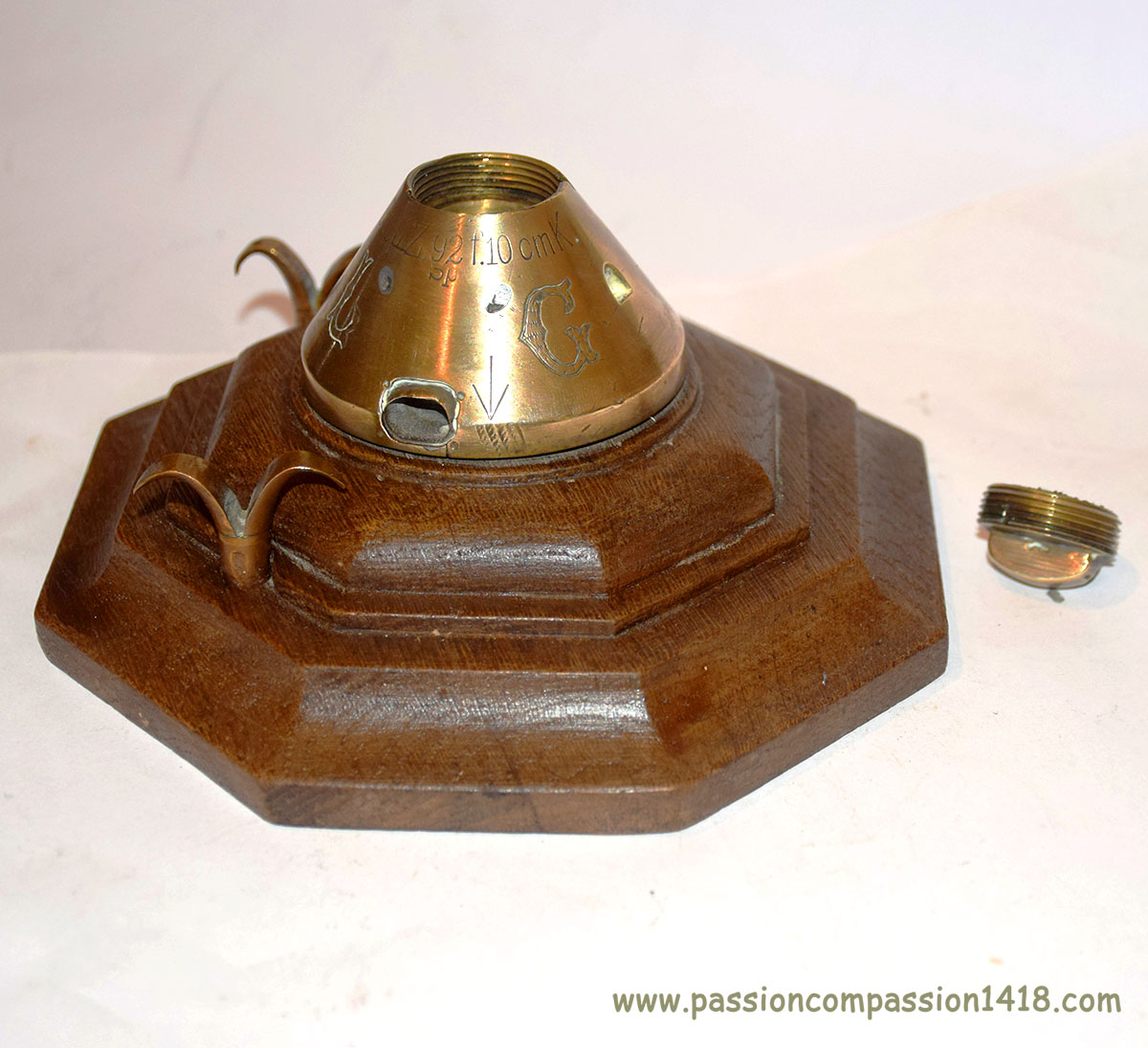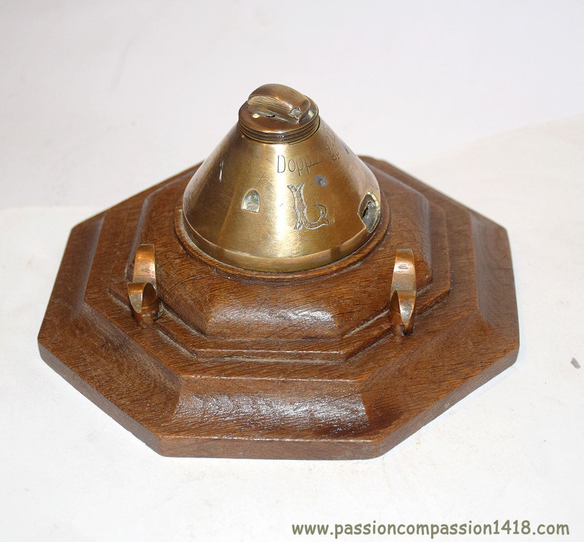 C'est une belle fusée allemande à double effet Dopp Z 92 nF qui a ici été transformée en encrier en évidant le puits du système percutant et en dotant la tête originale d'une boucle en laiton en facilitant le dévissage.