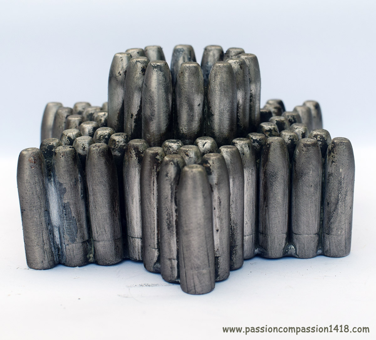 C'est le premier type de munitions originales type M, dont il devait rester des stocks utilsés pendant la Grande Guerre, qui a été utilisé pour cette oeuvre. Le symbôle 'S' encore visible sur certains méplats est la marque (non identifiée) du fabricant de l'alliage de la chemise.