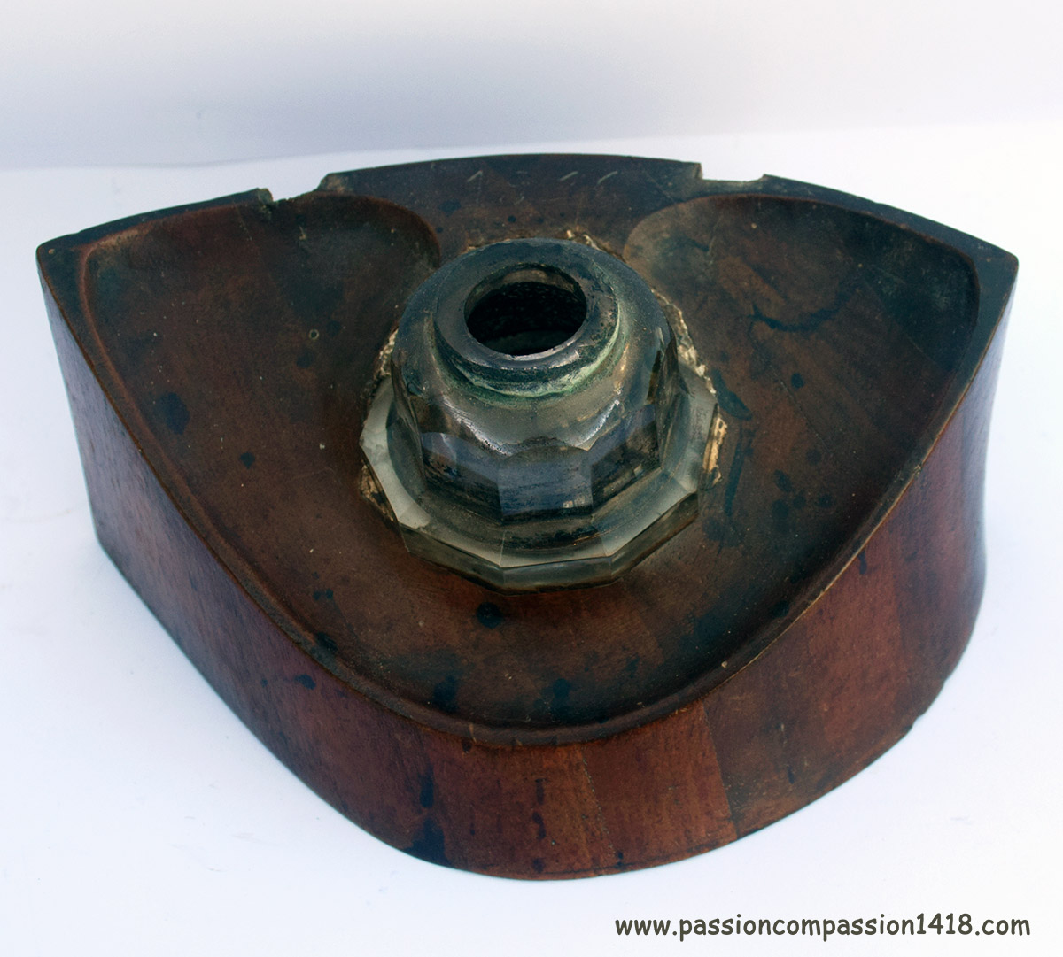 Cet encrier me donne l'impression d'un projet plutôt ambitieux, au vu de la taille du socle en bois sculpté, mais qui se termine avec une composition un peu décevante.