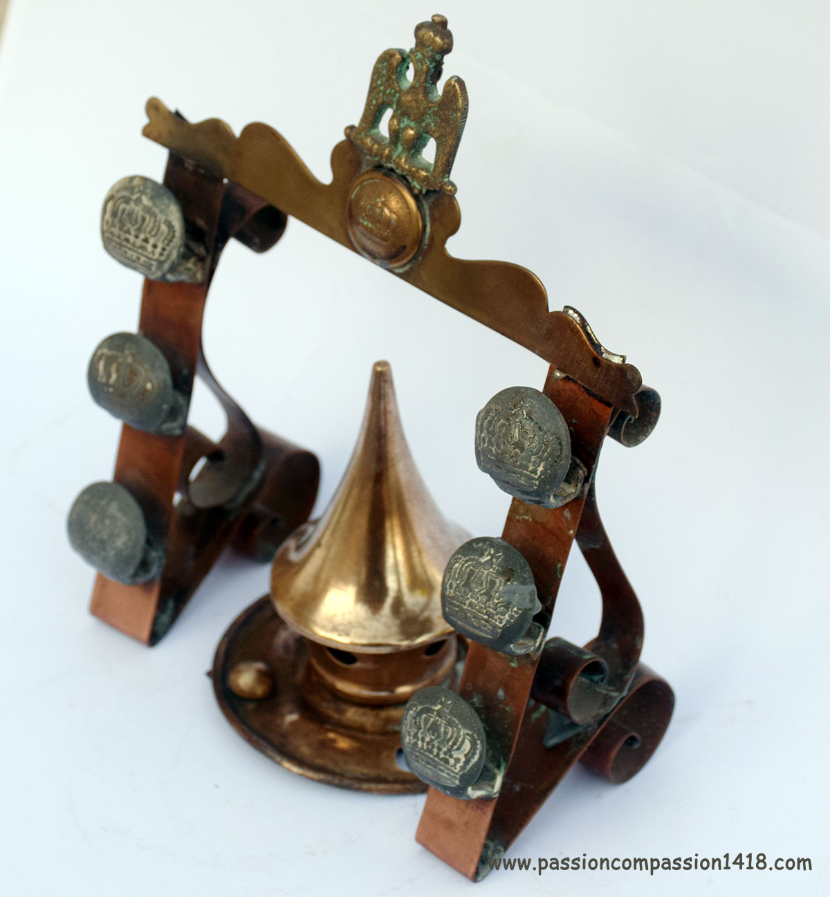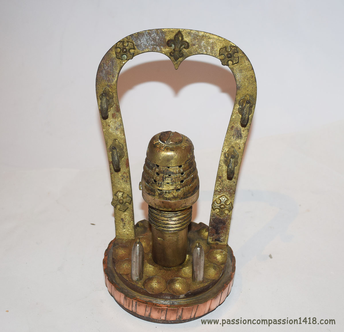 Cet ensemble central est posé sur un large socle en bois recouvert d'une feuille de laiton. La devanture de ce socle est garnie de 9 balles de fusil Mauser allemand également reliées par une chaînette. Je compte restaurer le tout. Une légère impression d'incomplétude se dégage du fait de l'absence de structure à l'arrière de la pièce.