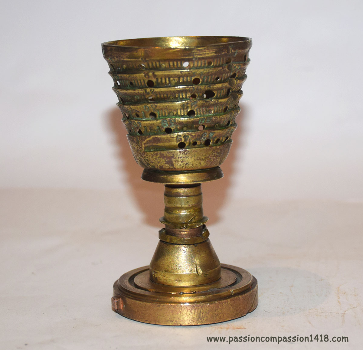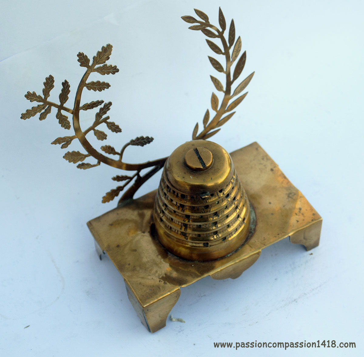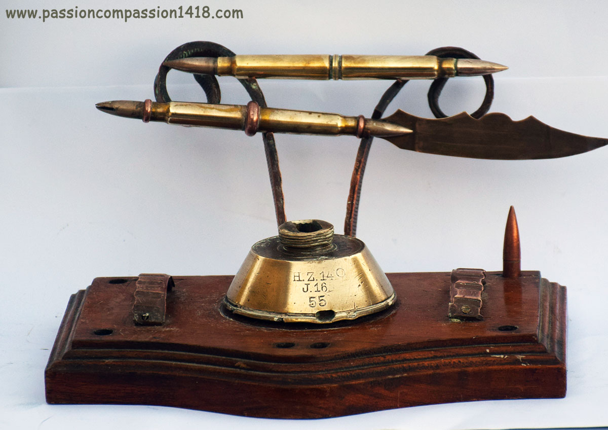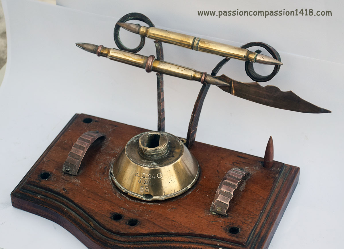 Il n'y a pas que les fusées d'artillerie qui servirent de base pour la réalisation d'encriers. Celui-ci a été réalisé avec pas moins de 66 balles de fusil français Lebel de 8mm, soudées ensemble dans un motif dont la base est une forme d'étoile à 6 branches, et avec un second étage hexahonal bâti autour d'un réservoir à encre central.