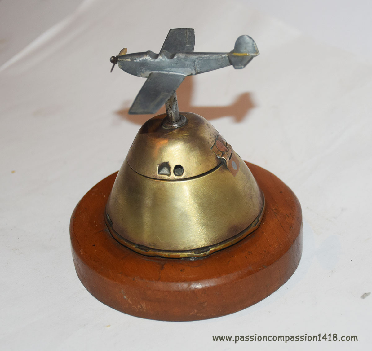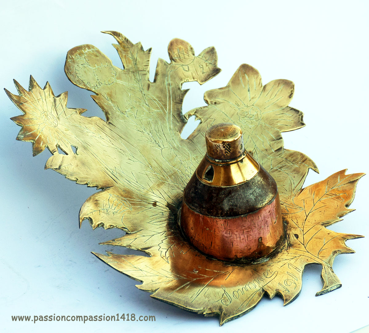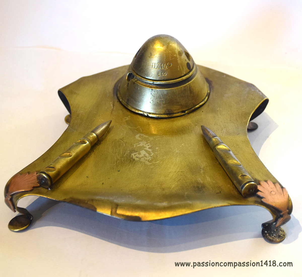 Encrier réalisé avec une fusée percutante HZ 14 allemande placée sur une feuille de cuivre découpée dans une douille et munie de 4 pieds.