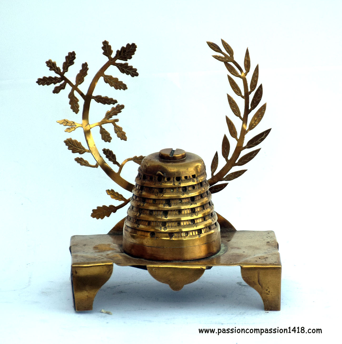 Pas d'autres matériau que le laiton pour ce joli presse-papier : celui d'une fusée française à double effet 30/55 Mle 1889 comme corps principal, et celui d'une douille pour le socle ainsi que pour le motif végétal qui prend la forme d'une couronne de lauriers.