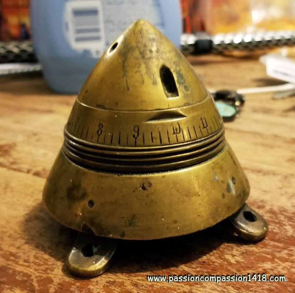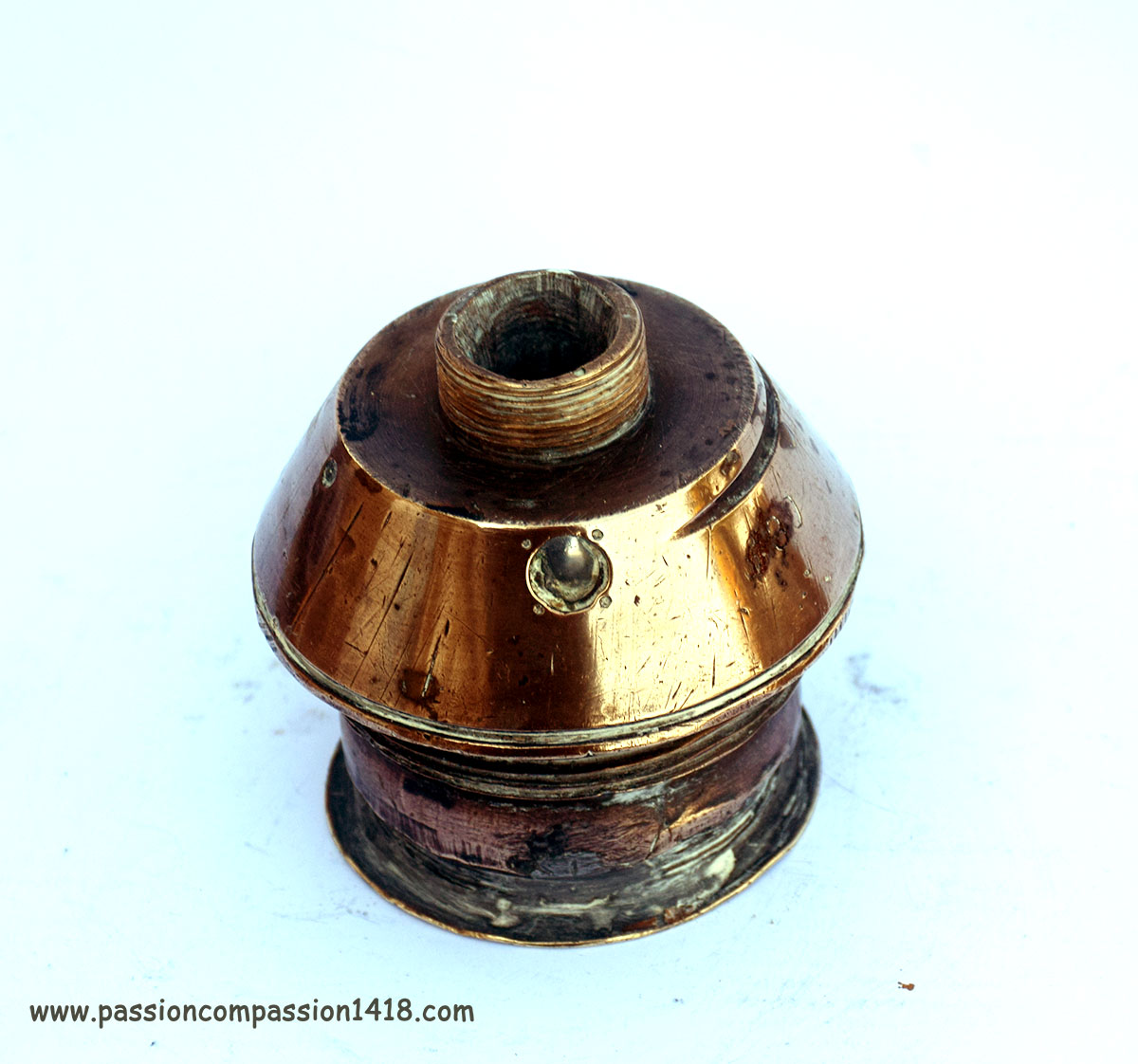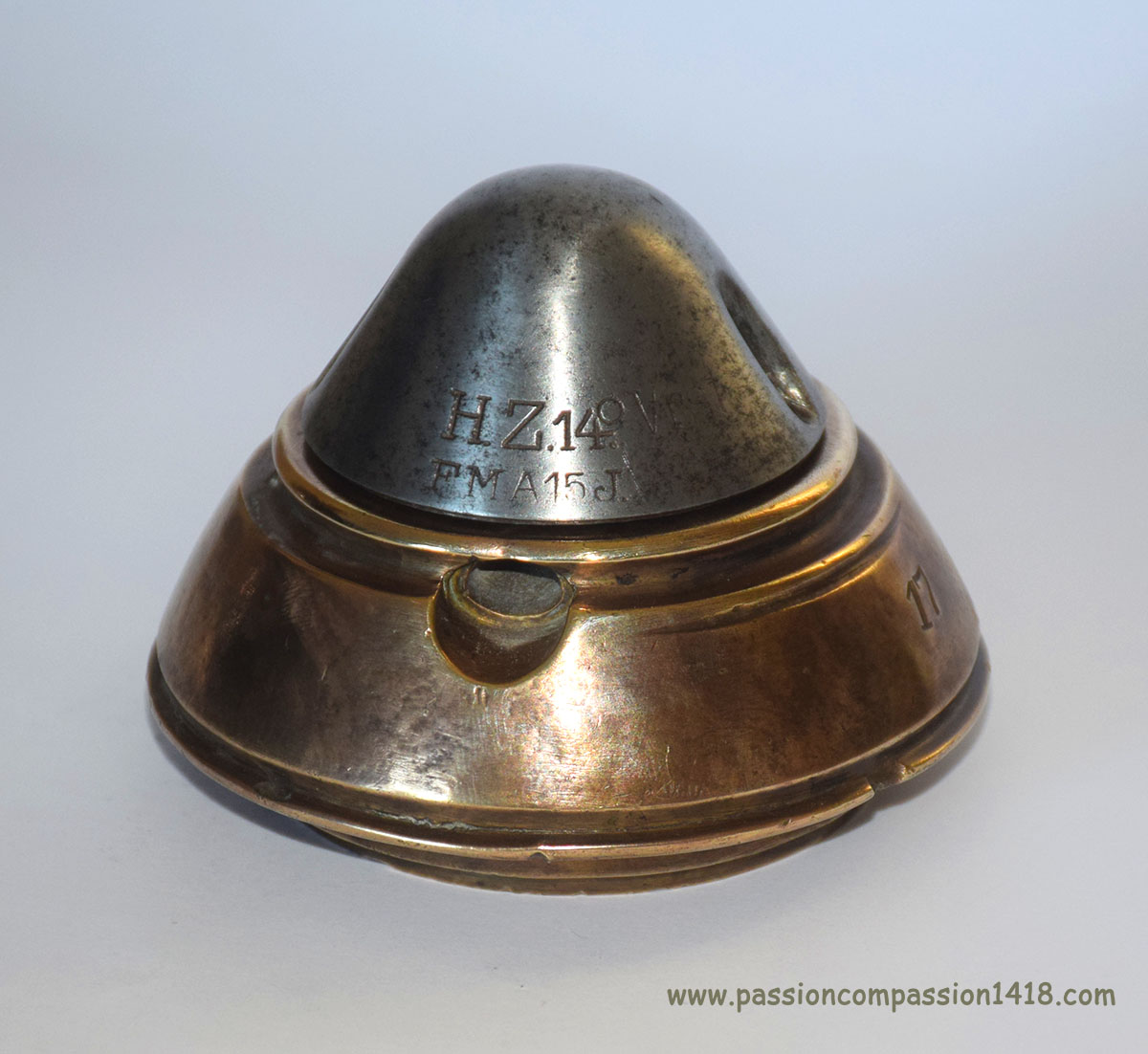 Cette fusée percutante HZ 14 allemande a été transformée en encrier de la manière la plus rudimentaire qui soit : coiffe retirée donnant accès au logement central du système percutant absent, et queue sciée et remplacée par une embase en laton soudée.