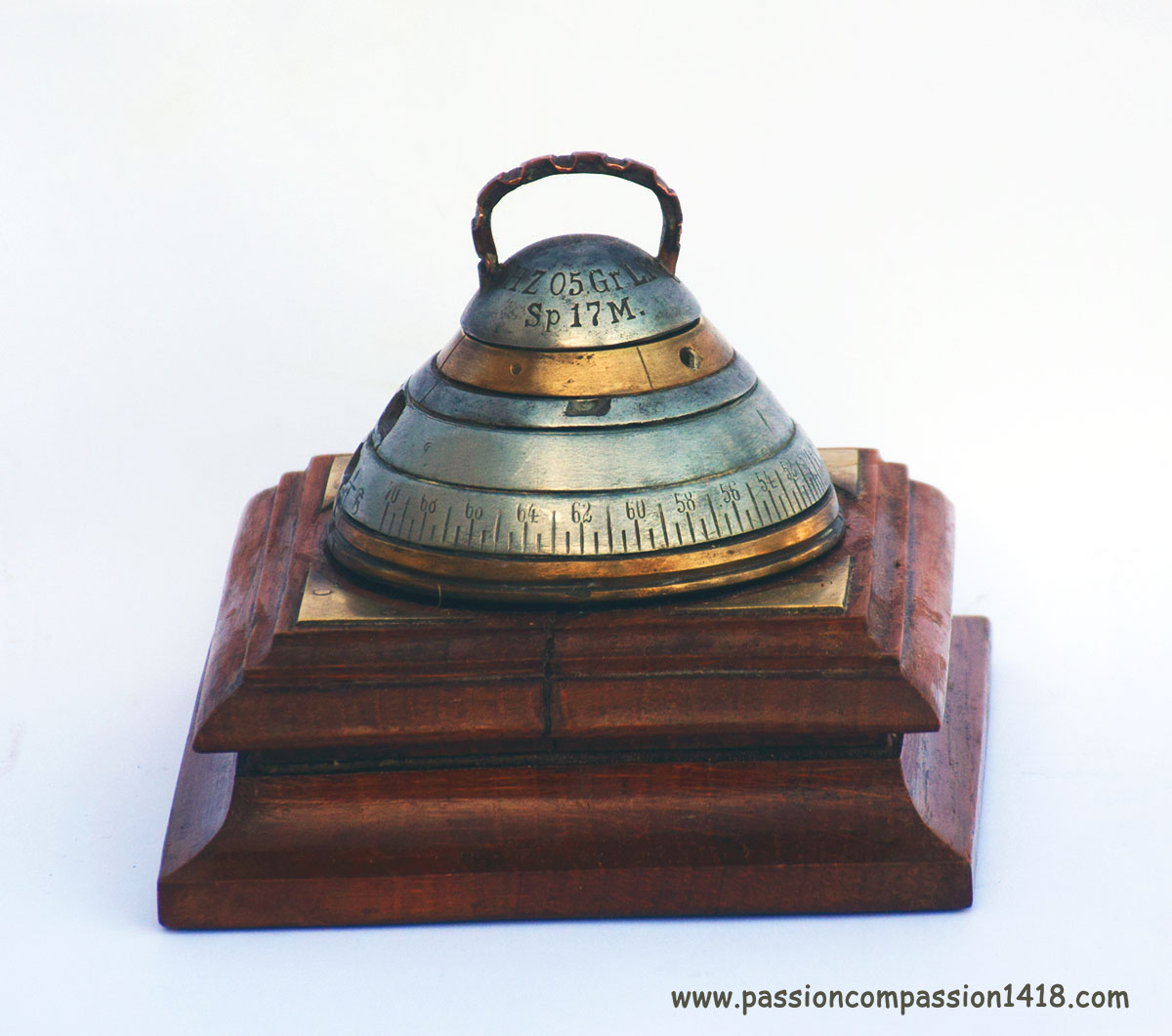 Outre l'utiliqation d'une fusée relativment rare, l'originalité de cette oeuvre réside particulièrement dans le motif artistique de la plaque en laiton servant de base, avec ses sillons repoussés dans le métal.