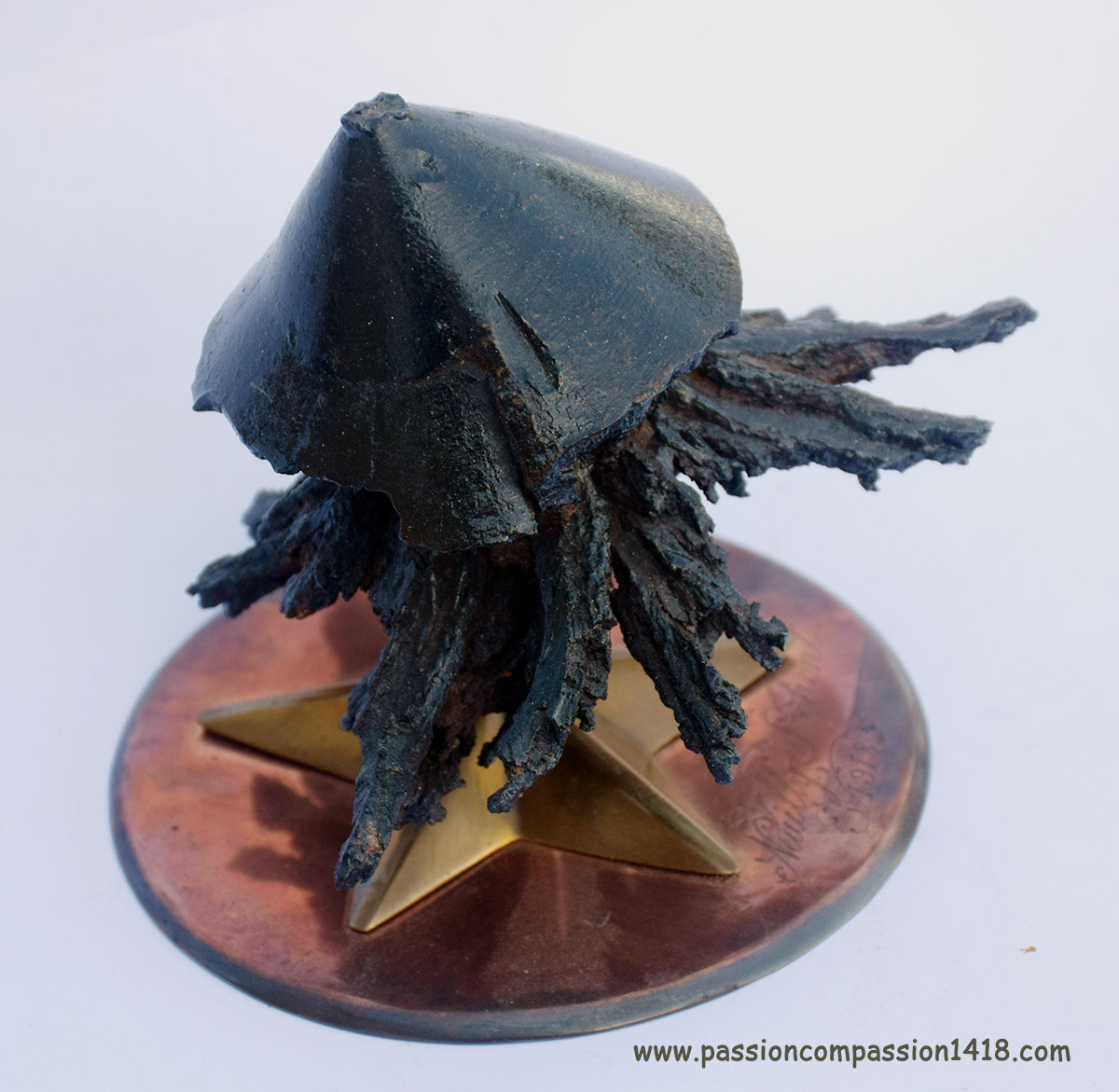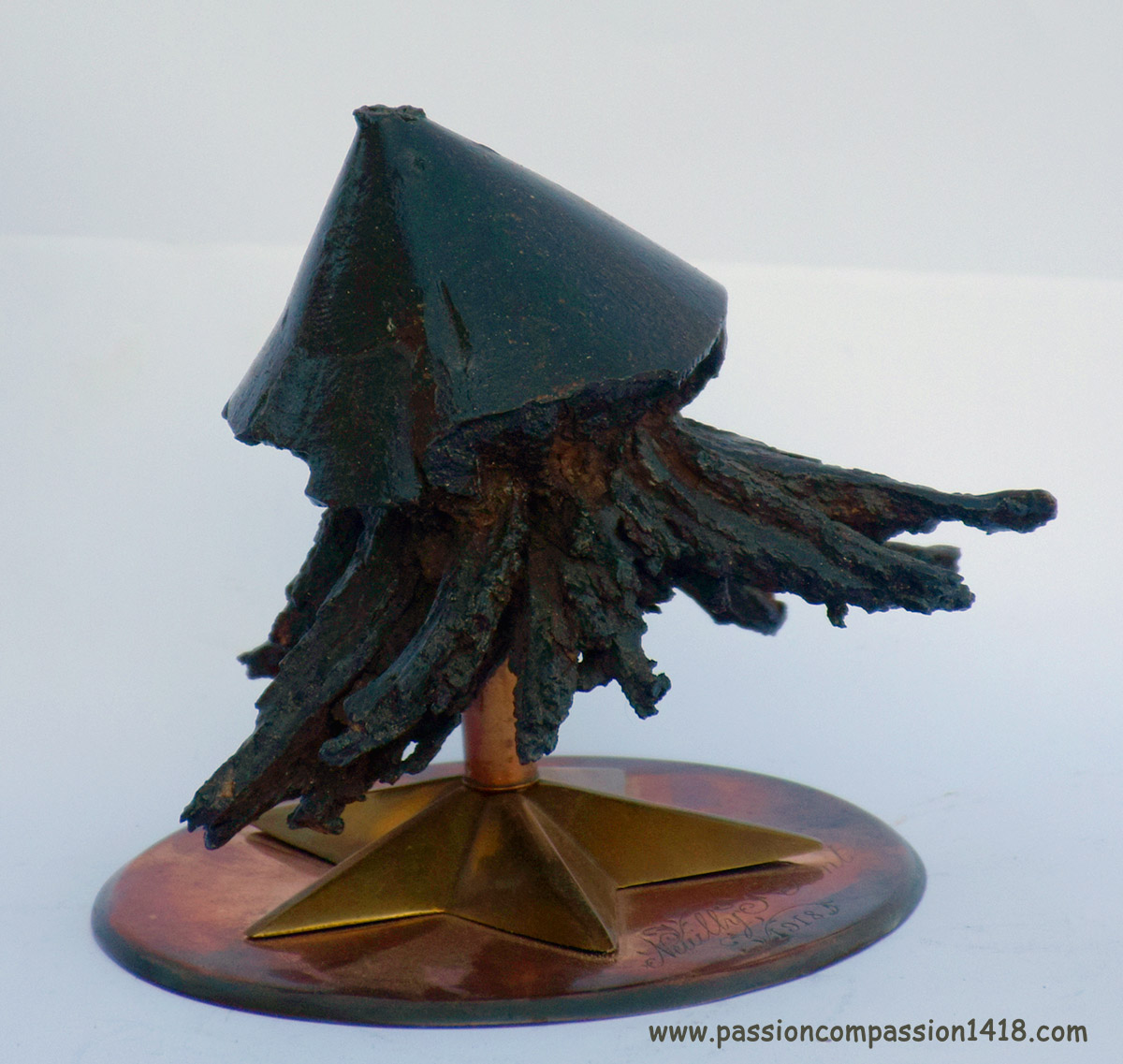 Le contraste est saisissant entre les formes pures du socle en cuivre décoré d'une étoile à cinq branches en relief, et l'aspect sauvage des éclats encore attachés à la fusée délabrée par l'explosion. Il renforce l'impression de léthalité de la tête d'obus, qui fut un jour projetée dans les airs et à grande vitesse armée de ces terribles appendices à la recherche de chairs à déchiqueter...