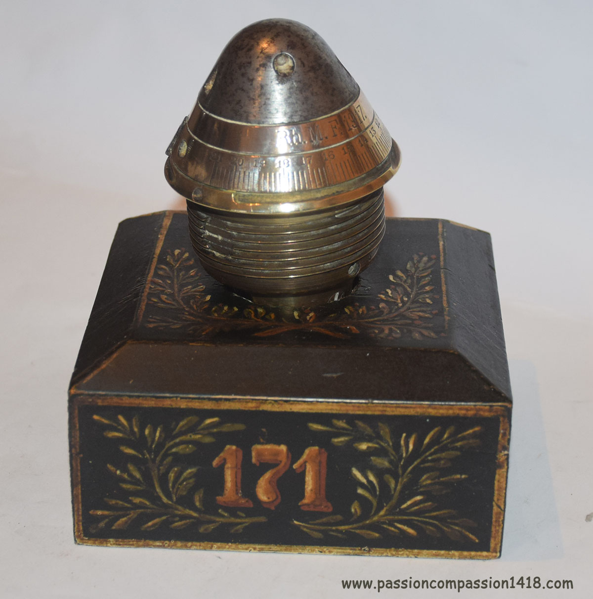 Cette Fusée lWMZdr2 allemande pour minenwerfer léger n'a subi que de petites transformations pour devenir ce très simple encrier. Comme dans la plupart des cas, le logement du mécanisme percutant a été évidé pour faire la place au réservoir d'encre, la coiffe rendue amovible pour servir de couvercle, et la queue sciée.L'originalité réside dans l'insertion d'un disque supplémentaire en laiton au-dessus du disque gradué de la fusée, afin de créer assez de hauteur pour intégrer le réservoir.