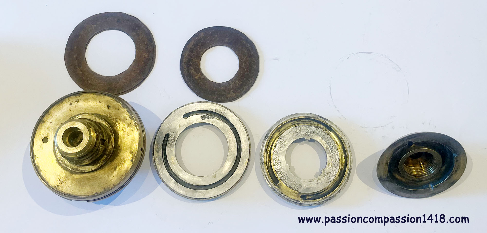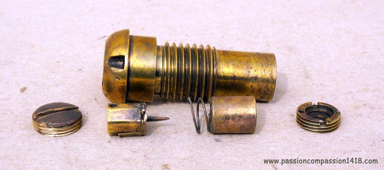 This 6 GT type percussion fuze, was composed, from head to tail, with a inertia concussion arming system with locking staple and safety spring, a hollow massive mobile cylinder housing a long static percussion needle, positionned axially through an integrated detonator and bearing at its lower extremity the primer cap that was kept at rest inside the safe detonation room preventing the effects of an unwanted premature triggering.