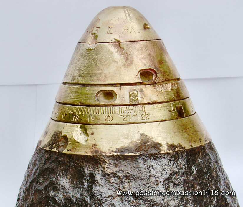| fusée Allemande à double effet (fusante et percutante) Dopp Z 92. La coupe permet de voir les organes internes de ce dispostif mécanique et pyrotechnique sophistiqué. | |