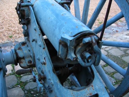 Vue sur la culasse typique du systeme de Bange.Une seconde pièce du même modèle, mais dépourvue de sa culasse, est visible sur le même site (Fabrication : J. Sturmlinger, constructeur- mécanicien – Havre 1883 – N°78).