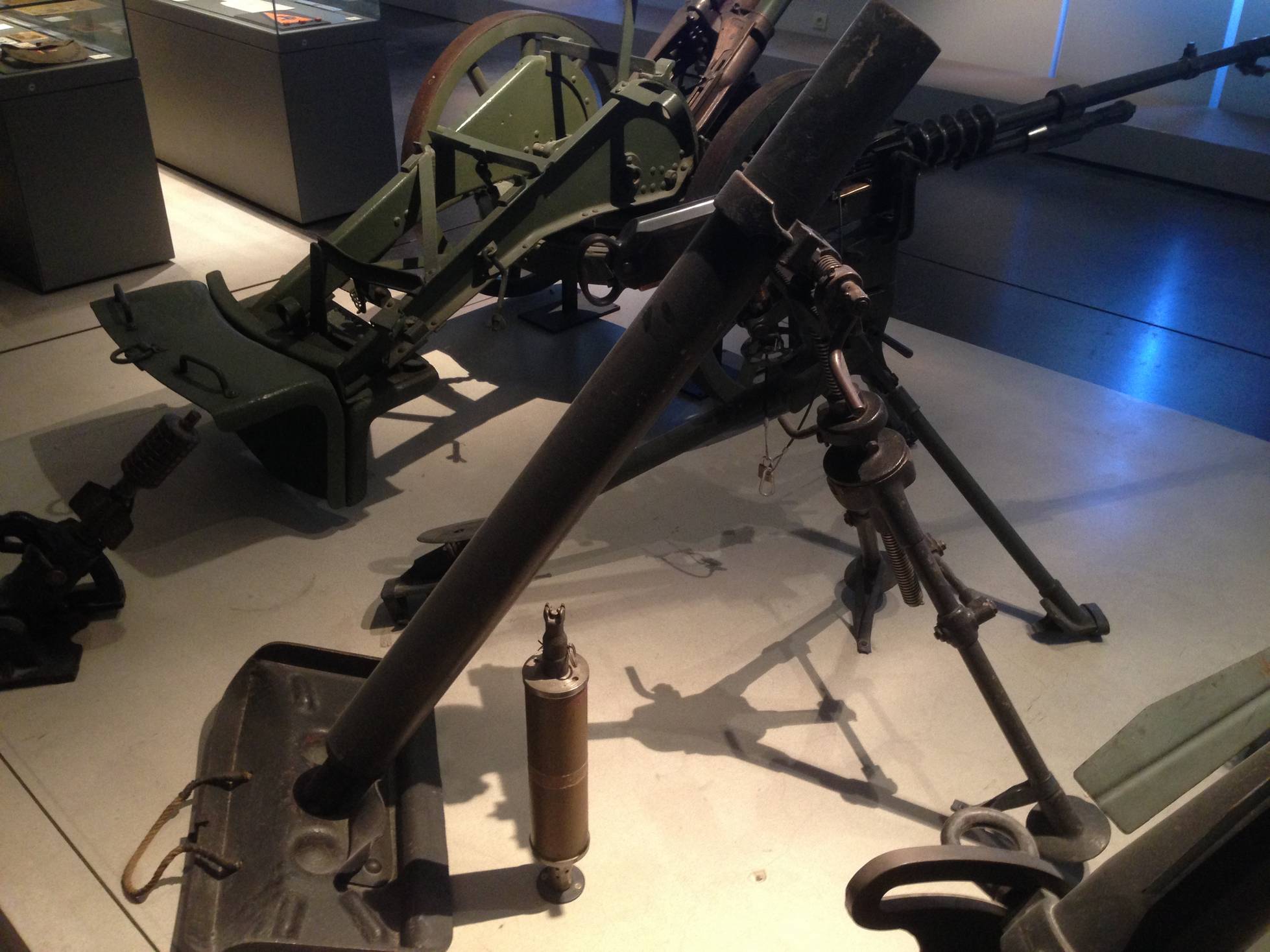 The '3 inches Stokes mortar' was made of a simple smooth bore tube 3.2 inches caliber, mounted on two-legs at its upper end, and a steel plate base at its lower end. The elevation could be tuned thanks to a screw system linking the tube to the two legs.