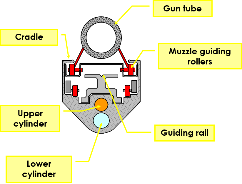 The gun was equipped with a hydropneumatic recuperator brake (or 'recoiling system') mechanism, intended to absorb the considerable recoiling energy at the firing on a total course of 1093 mm and to restore it automatically to draw back the gun in position without a need for re-pointing (see diagram).