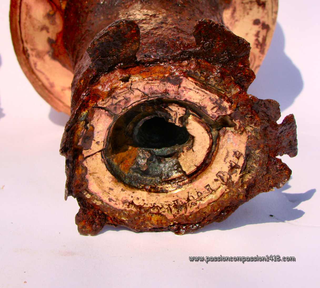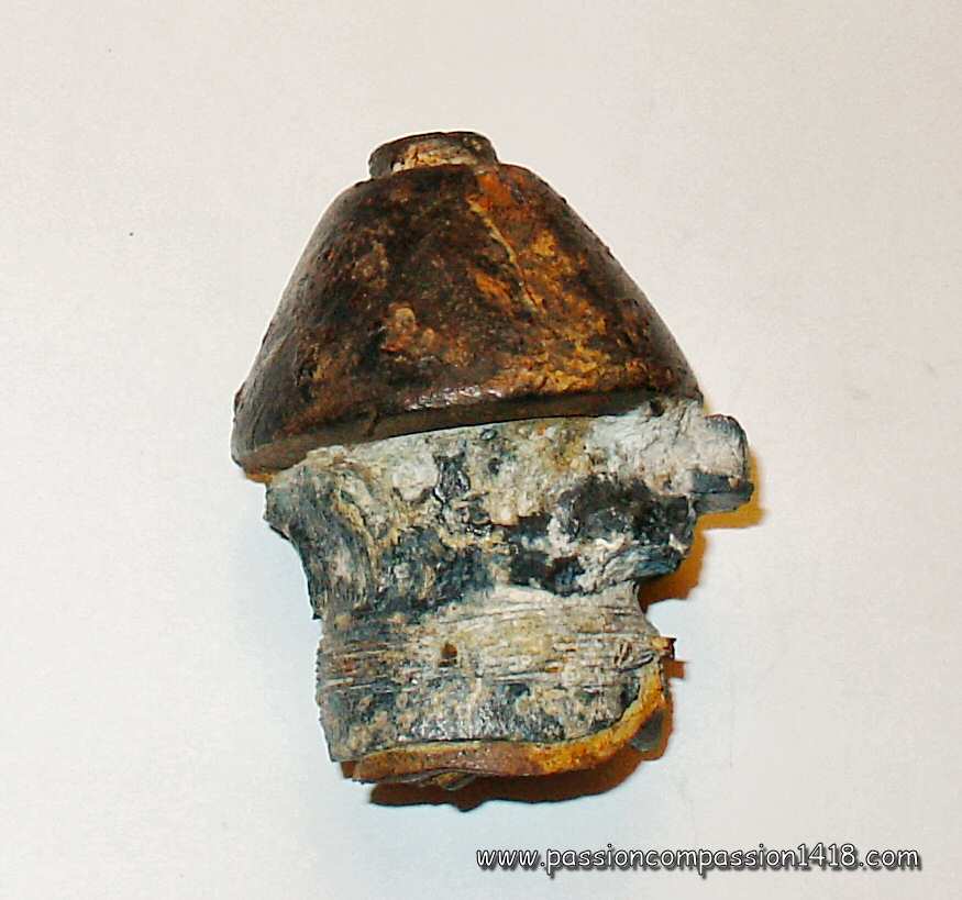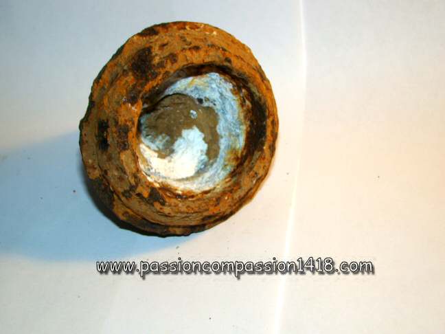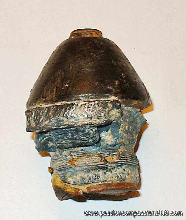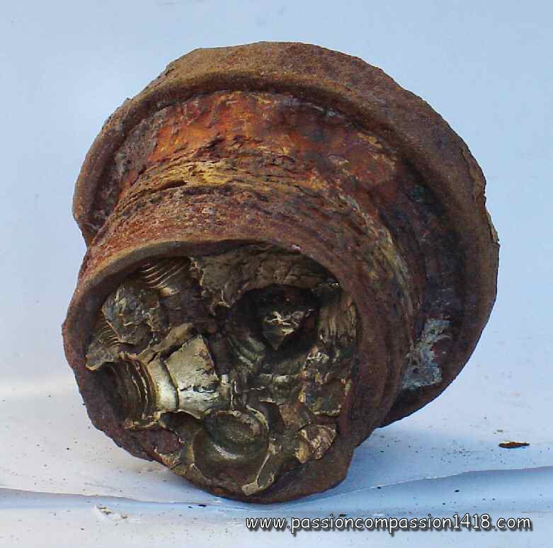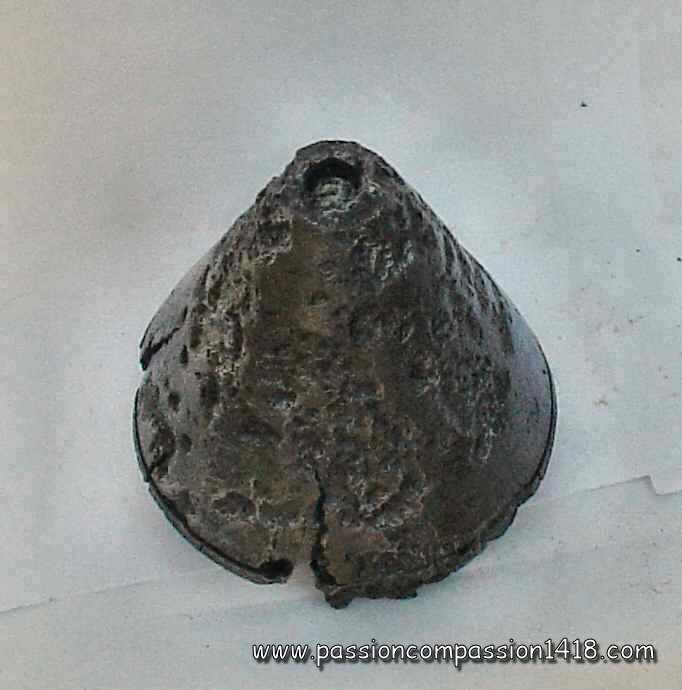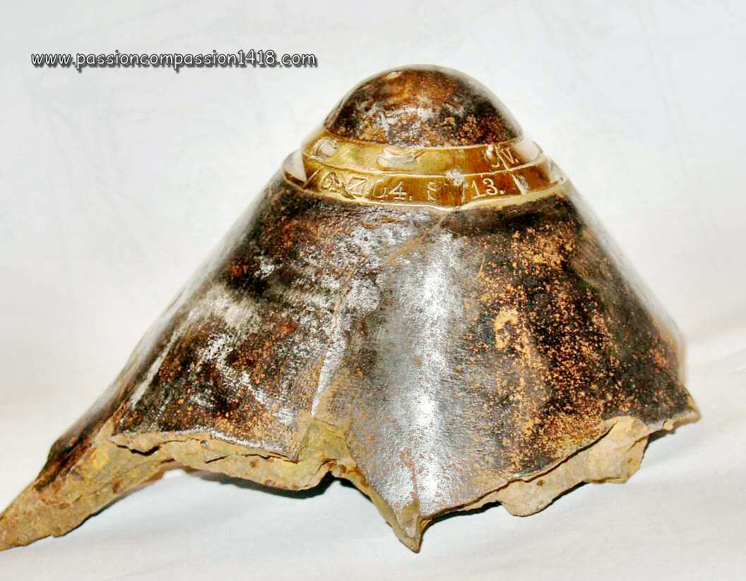 fuze GrZ 96/04. Still attached to a fragment of the shell head, evidently a large caliber one. The thickness of the steel wall of the shell (over 25 mm) makes us think to a 210 mm shell ! The shell remains keep some traces of red-brown painting |
