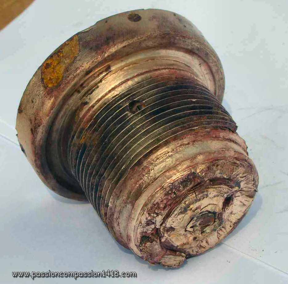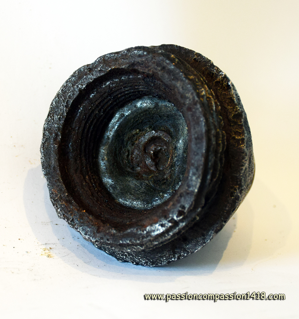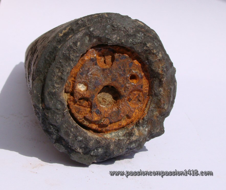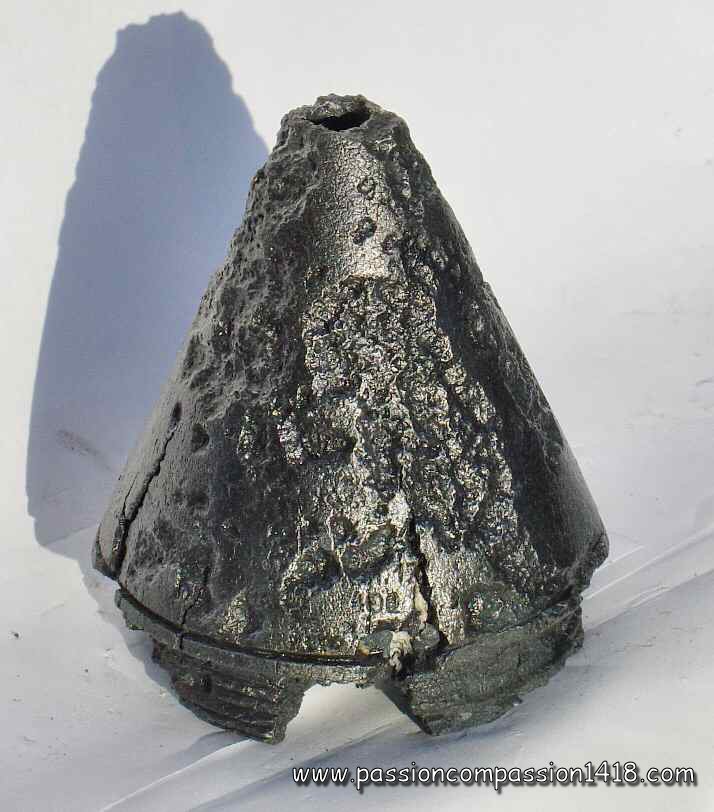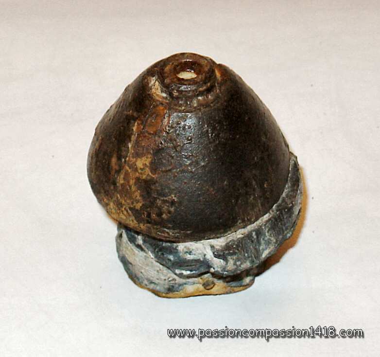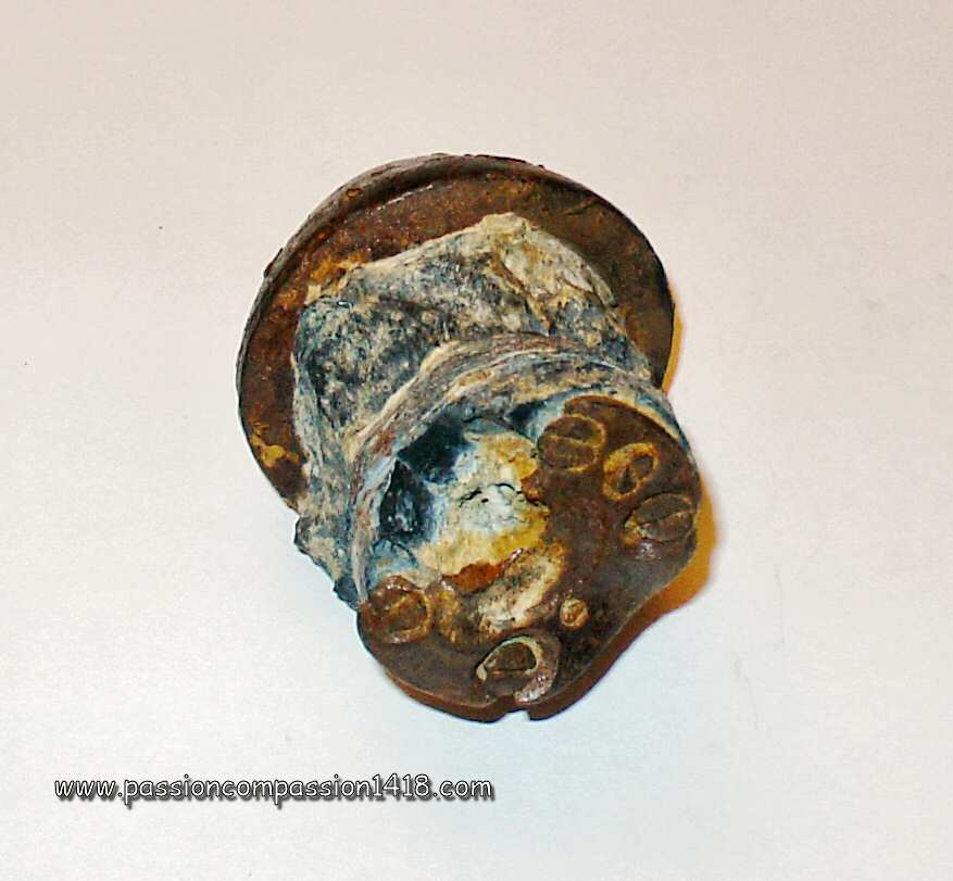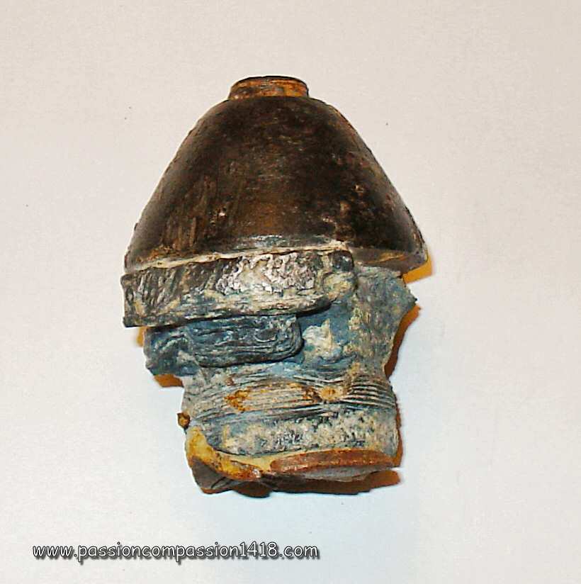 fuze GrZ 96/04. Still attached to a fragment of the shell head, evidently a large caliber one. The thickness of the steel wall of the shell (over 25 mm) makes us think to a 210 mm shell ! The shell remains keep some traces of red-brown painting |