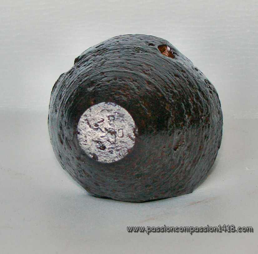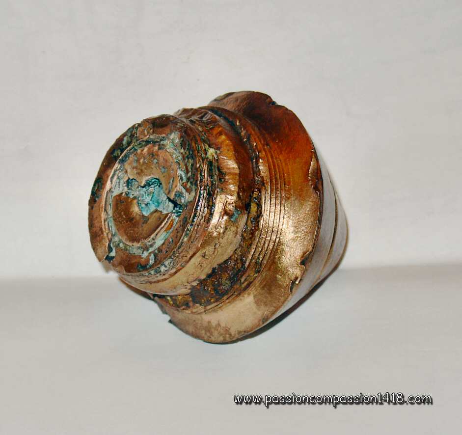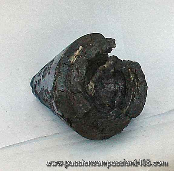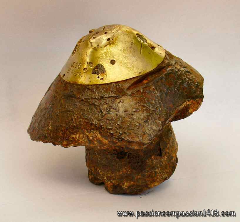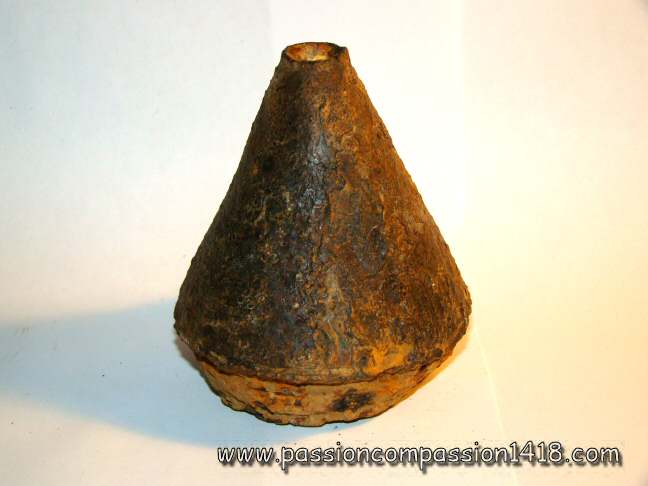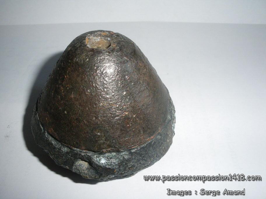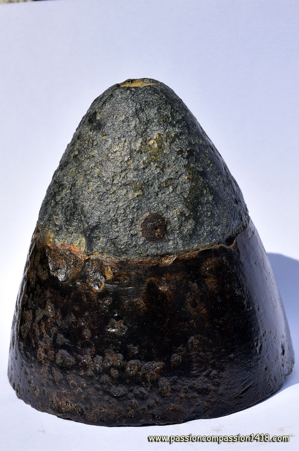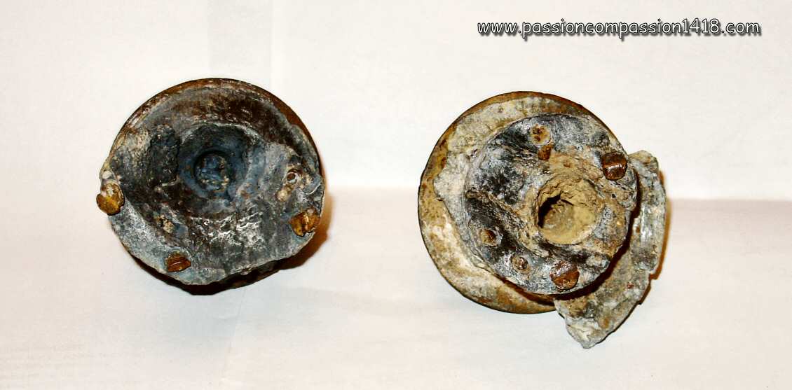 fuze GrZ 96/04. Still attached to a fragment of the shell head, evidently a large caliber one. The thickness of the steel wall of the shell (over 25 mm) makes us think to a 210 mm shell ! The shell remains keep some traces of red-brown painting |