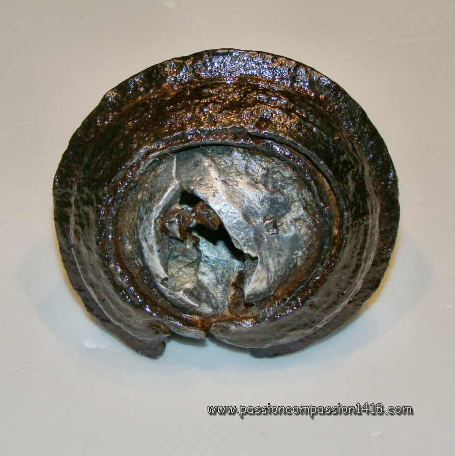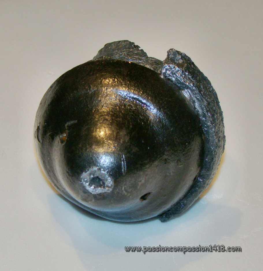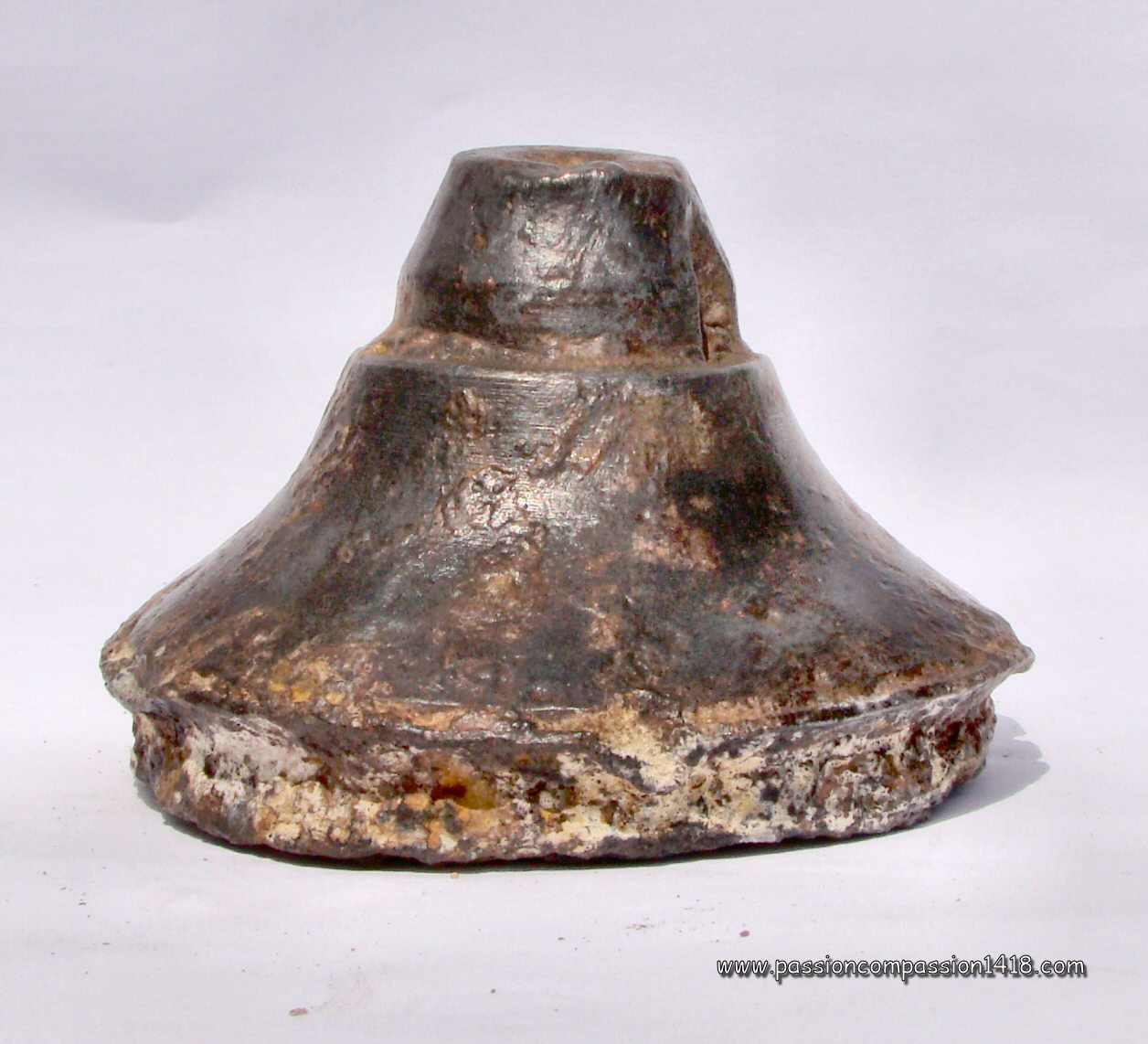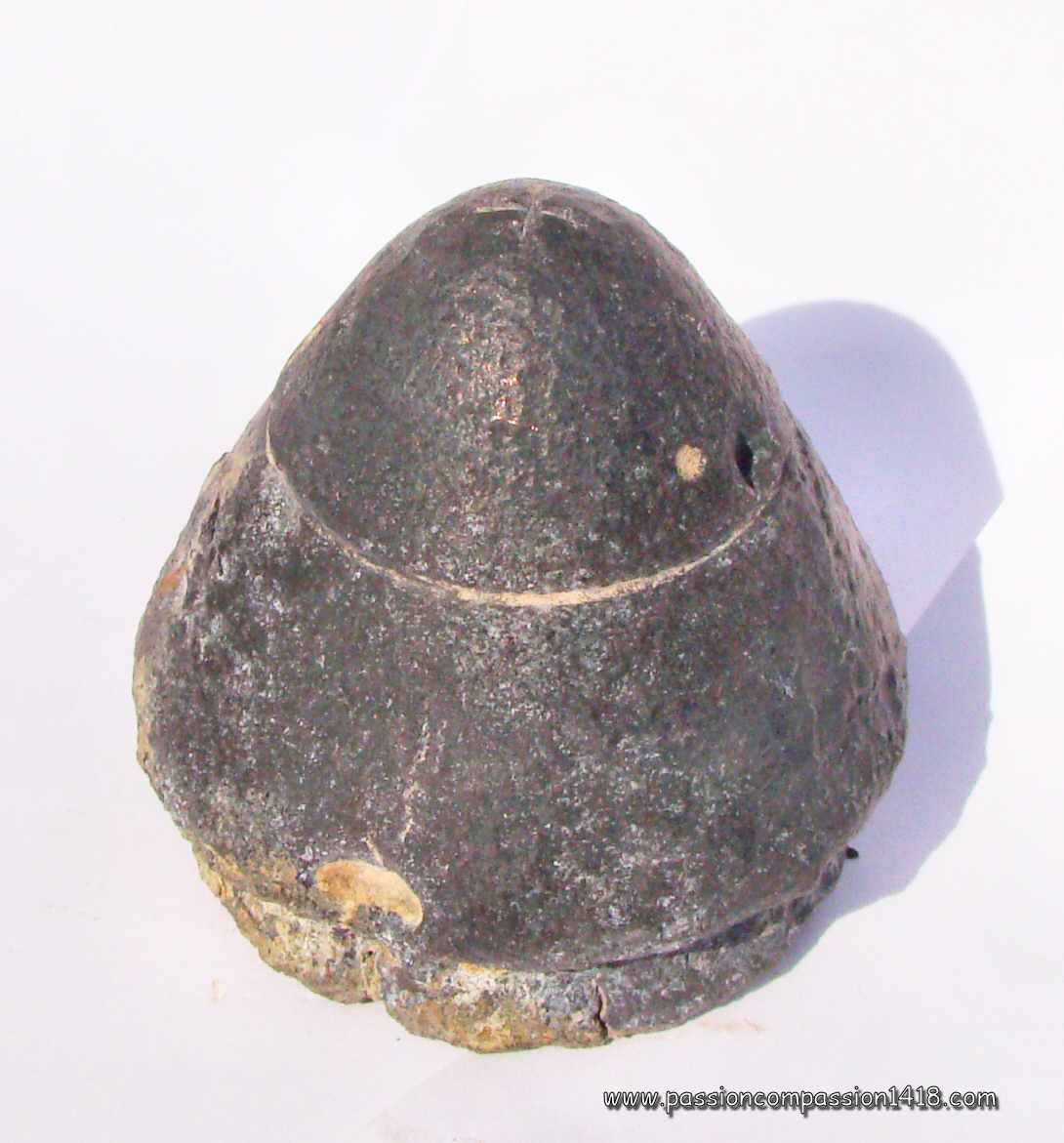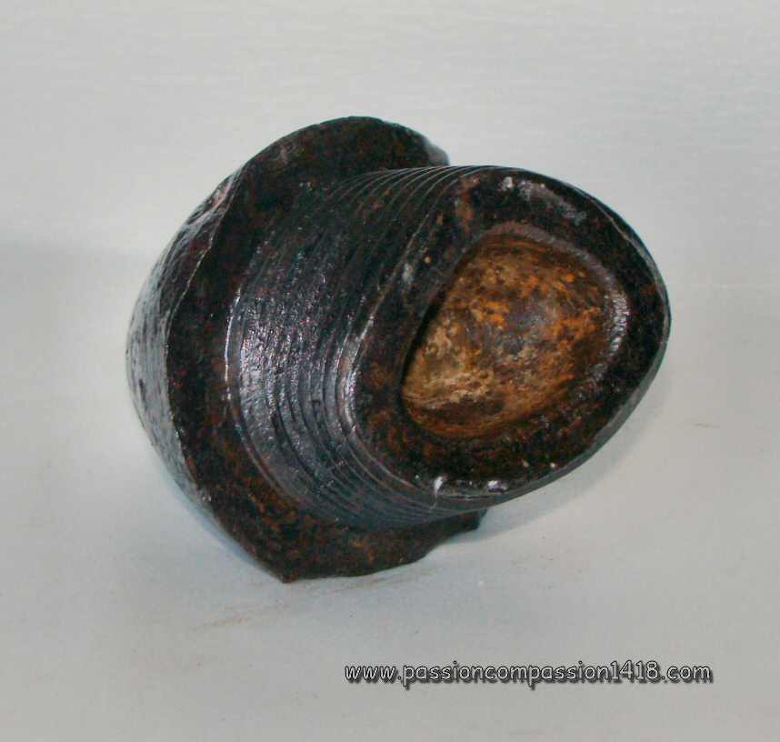 fuze GrZ 96/04. Still attached to a fragment of the shell head, evidently a large caliber one. The thickness of the steel wall of the shell (over 25 mm) makes us think to a 210 mm shell ! The shell remains keep some traces of red-brown painting |