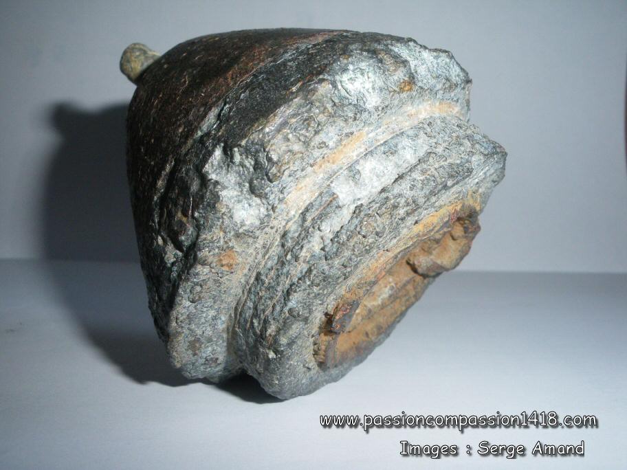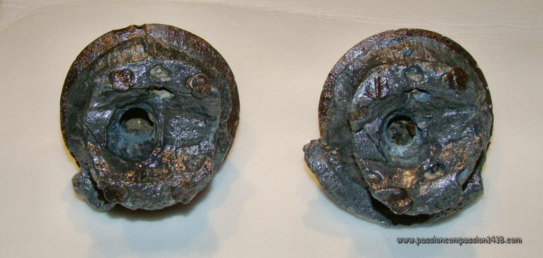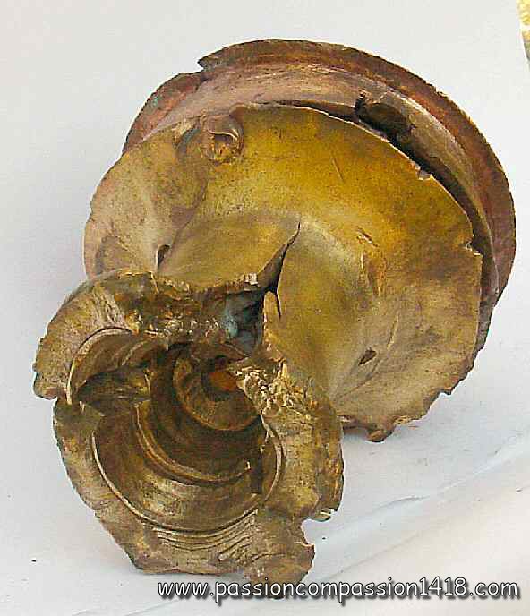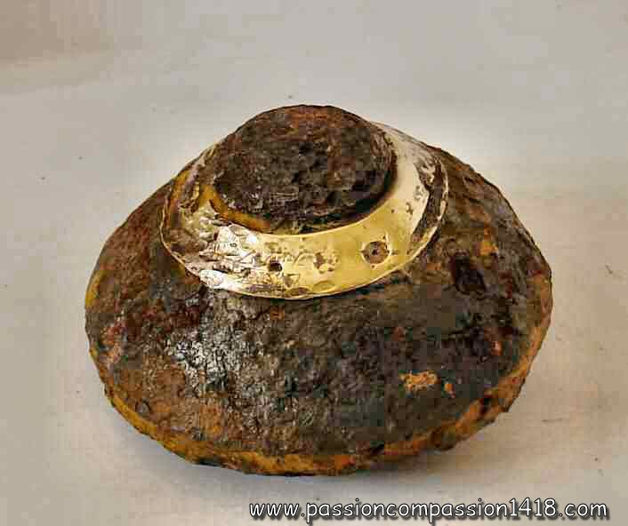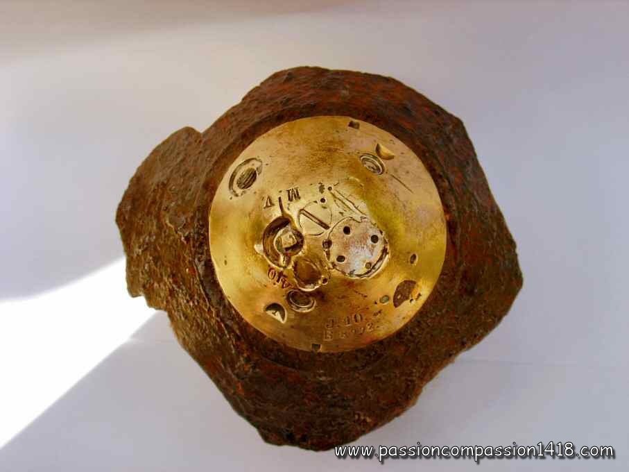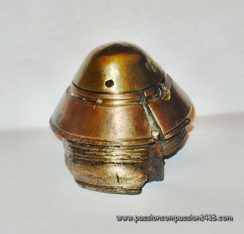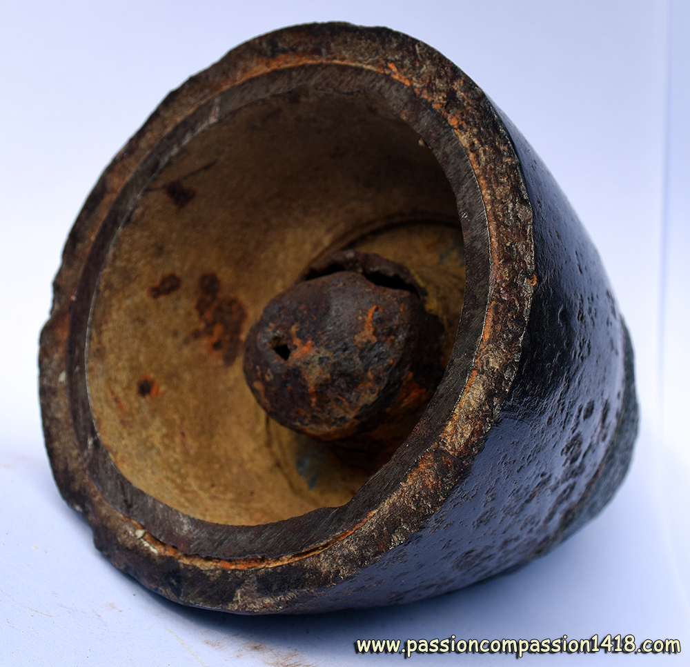 fuze GrZ 96/04. Still attached to a fragment of the shell head, evidently a large caliber one. The thickness of the steel wall of the shell (over 25 mm) makes us think to a 210 mm shell ! The shell remains keep some traces of red-brown painting |