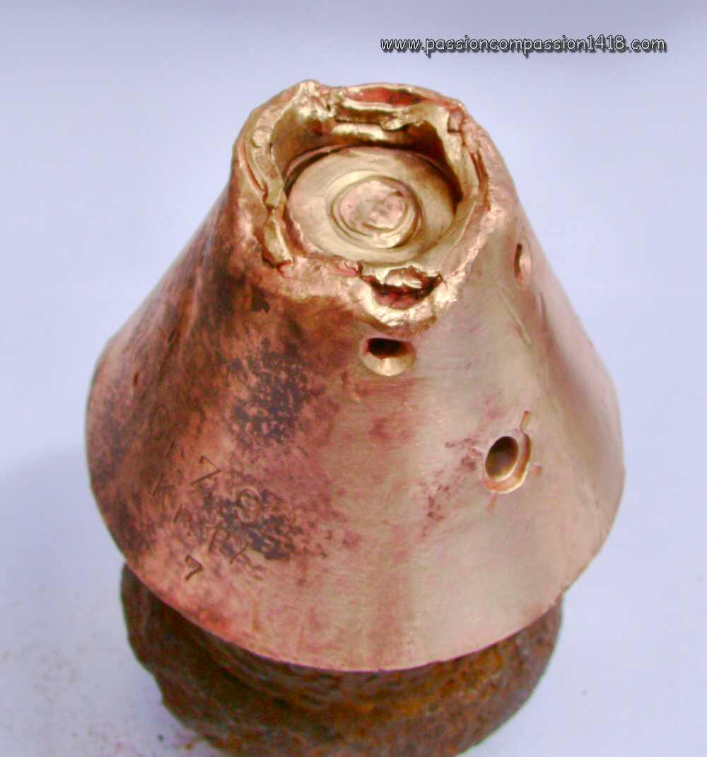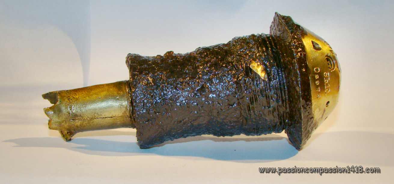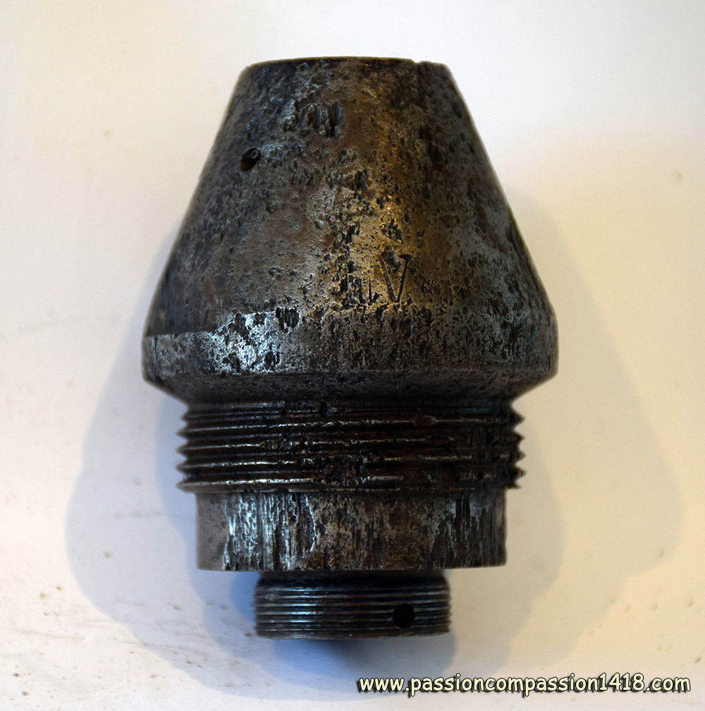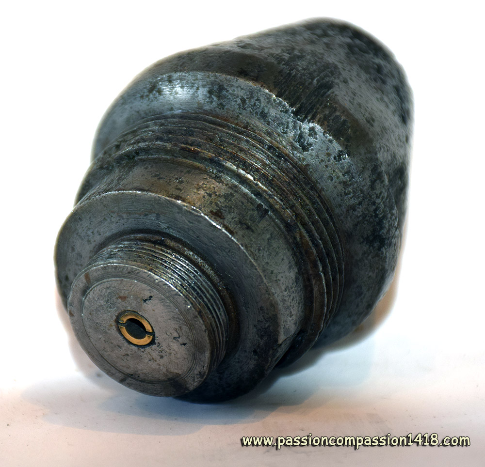 fuze Gr Z 04. Another specimen with markings 'Gr Z 04 Sp15 - E3177 - O/V - M/V - 48 - 18 - 99 - 17 - B70 - 81'. Note the narrowed section at the threading level, caused by the pressure of the explosion. |