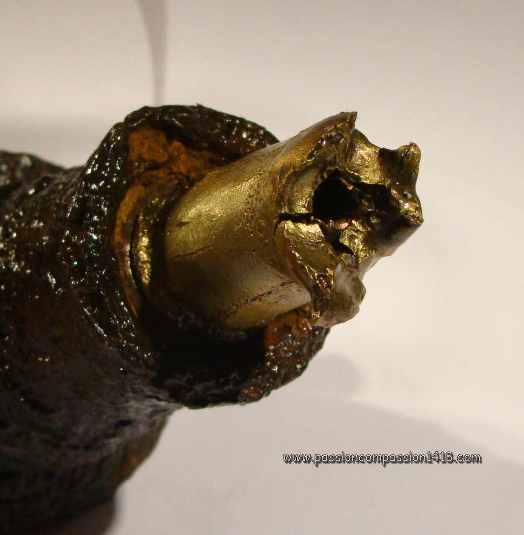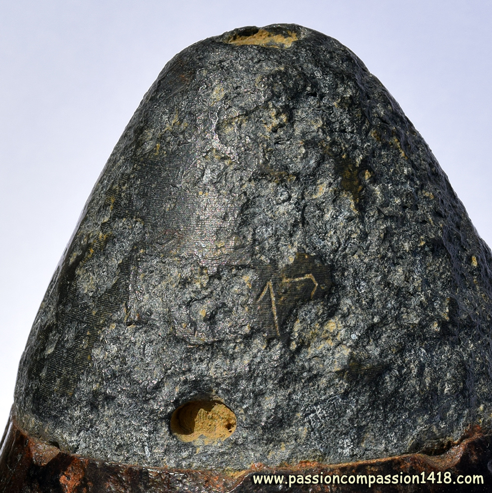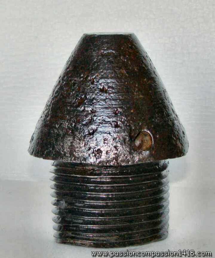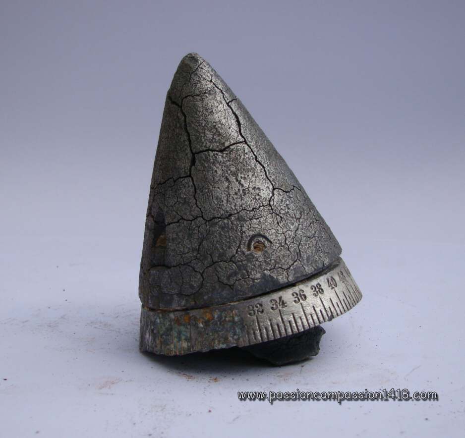 fuze Gr Z 04. Another specimen with markings 'Gr Z 04 Sp15 - E3177 - O/V - M/V - 48 - 18 - 99 - 17 - B70 - 81'. Note the narrowed section at the threading level, caused by the pressure of the explosion. |