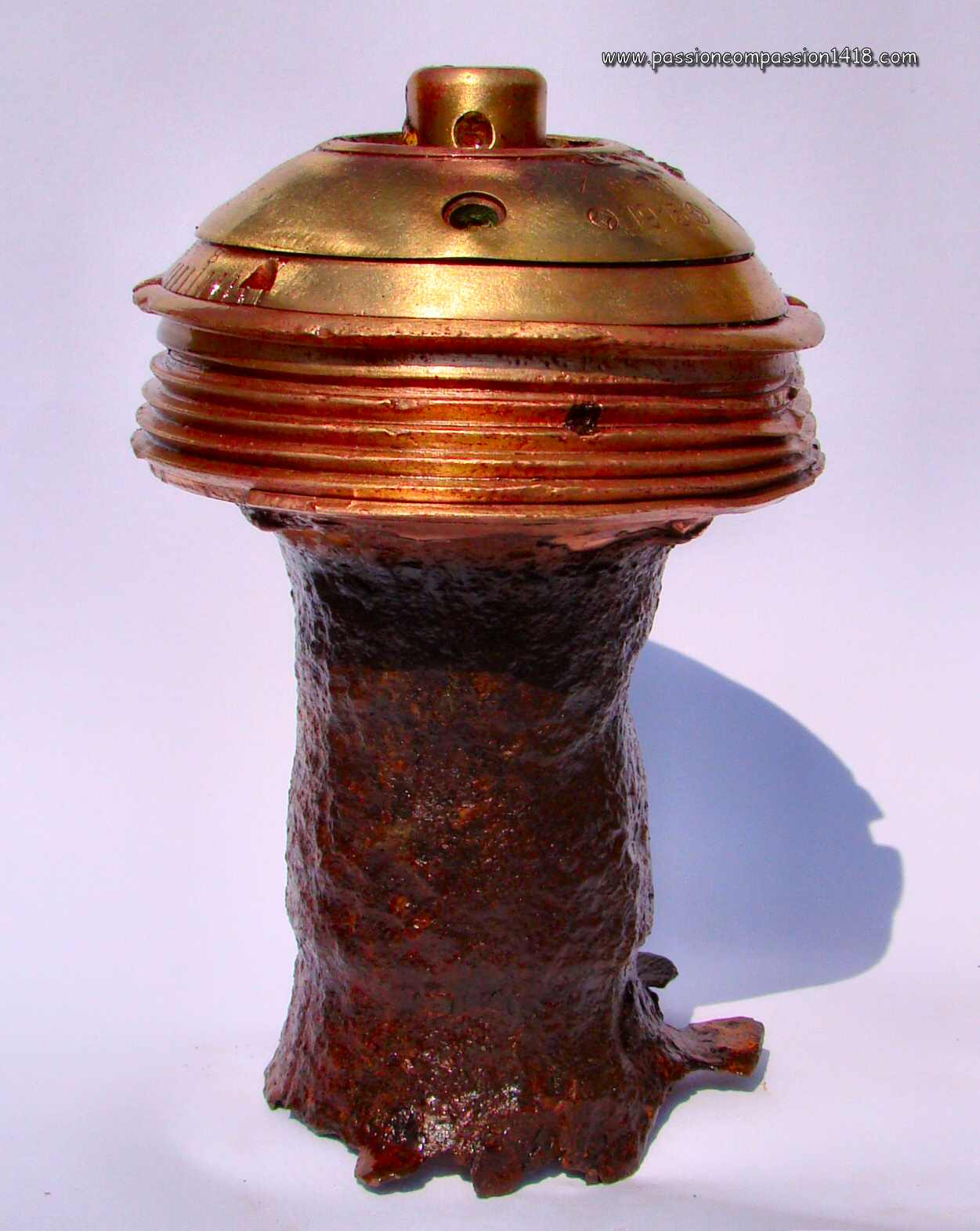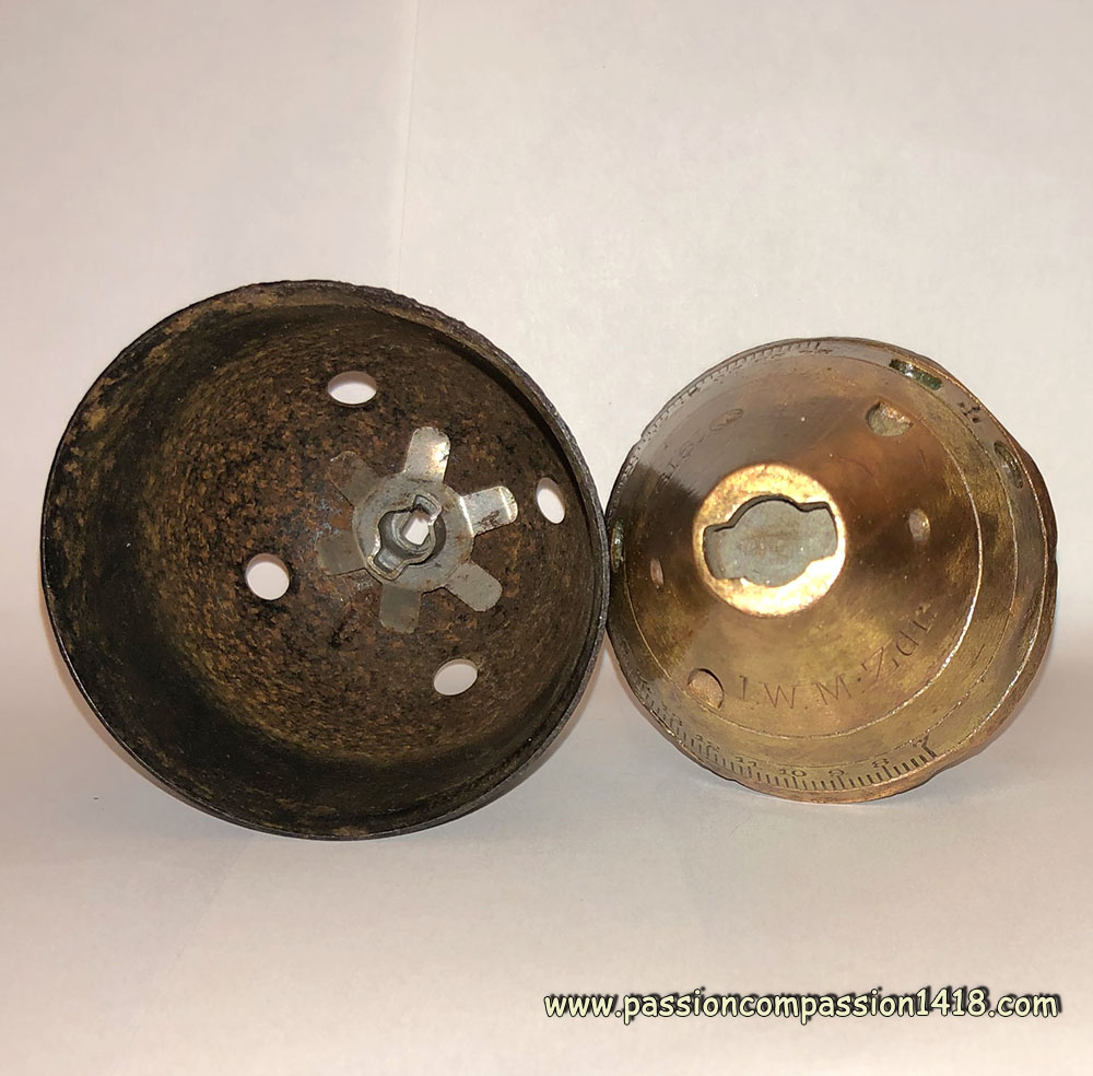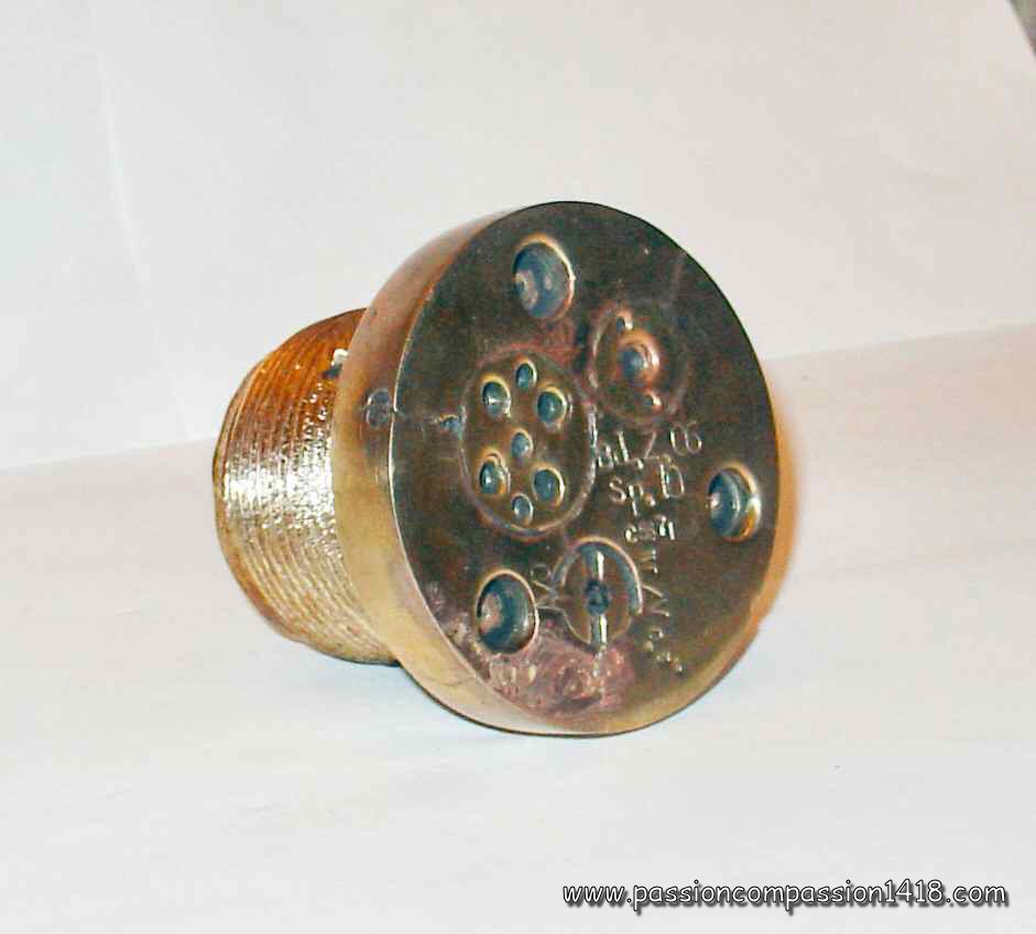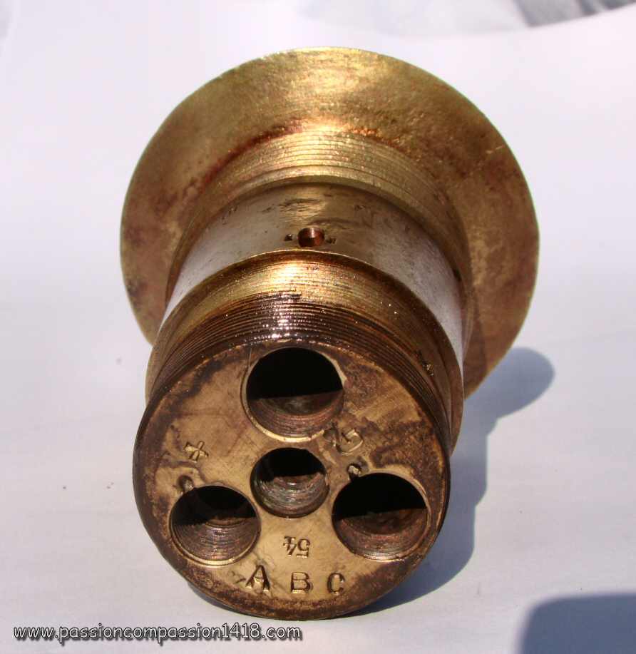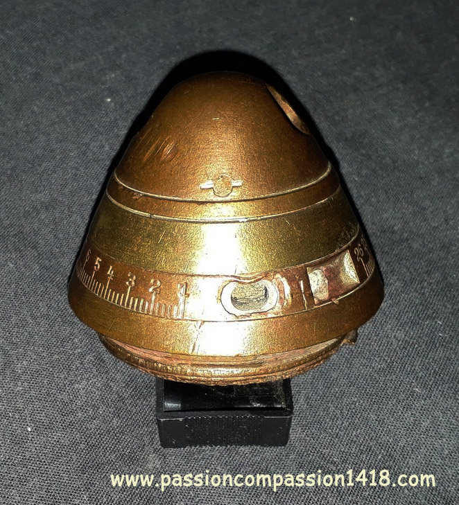 Entirely made of brass, this fuze had two percussion systems aligned vertically in the same central axial channel : From the fuze tail to the fuze base, this pyrotechnic column was composed of