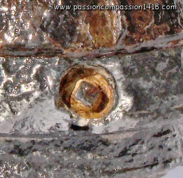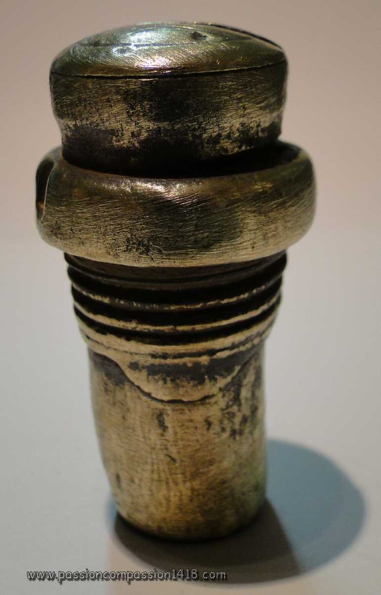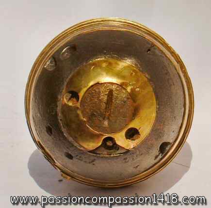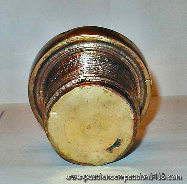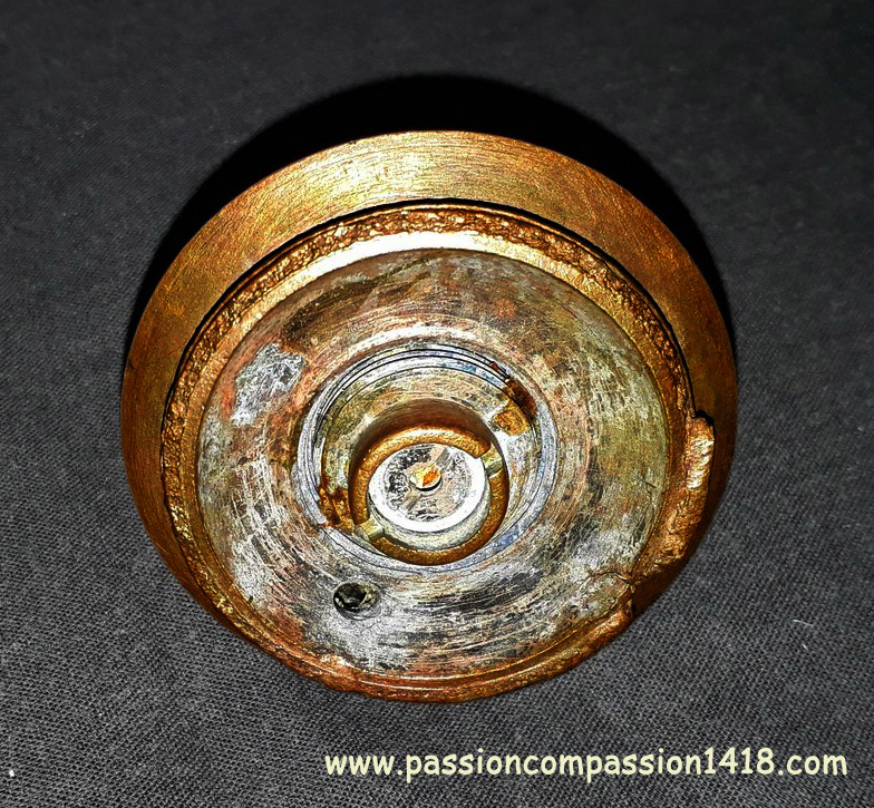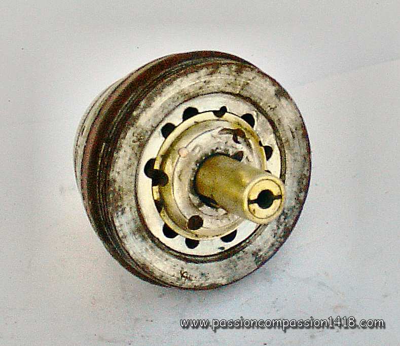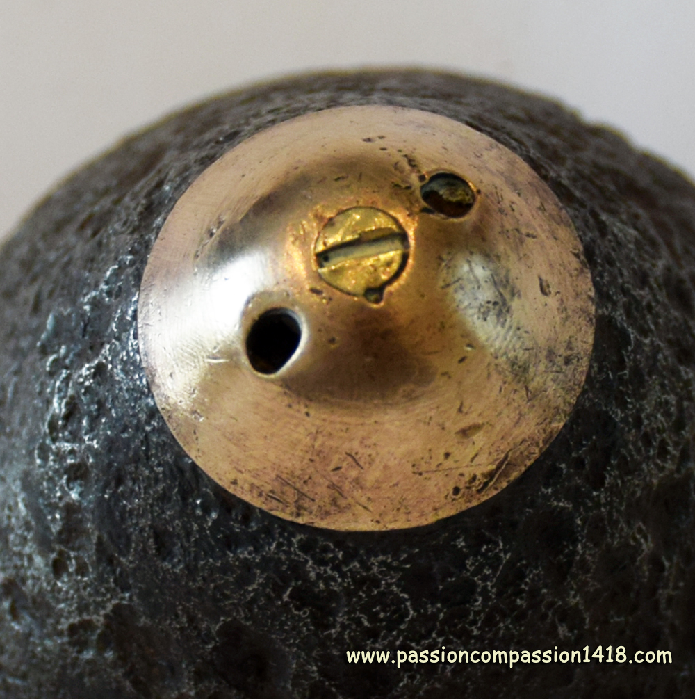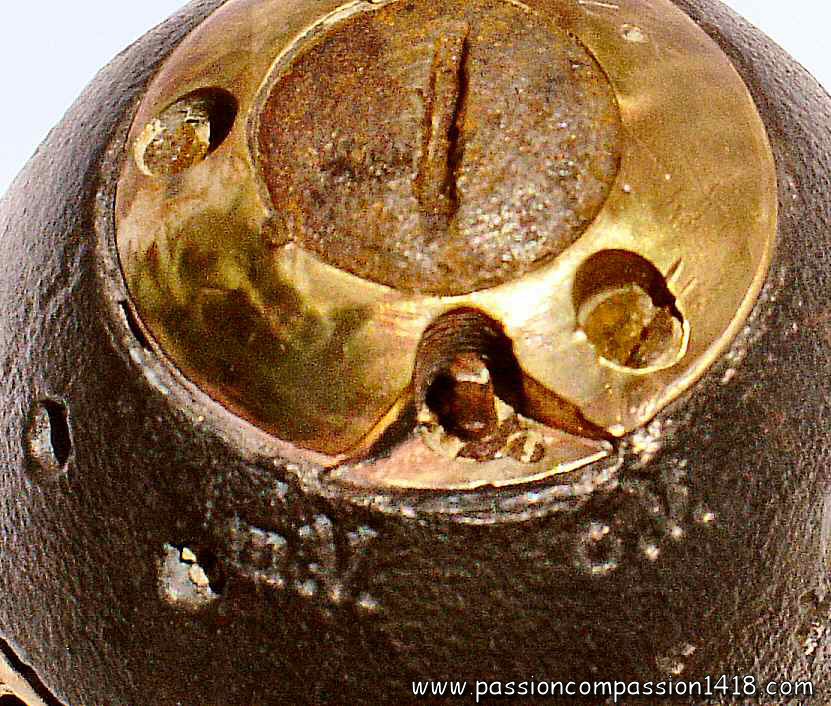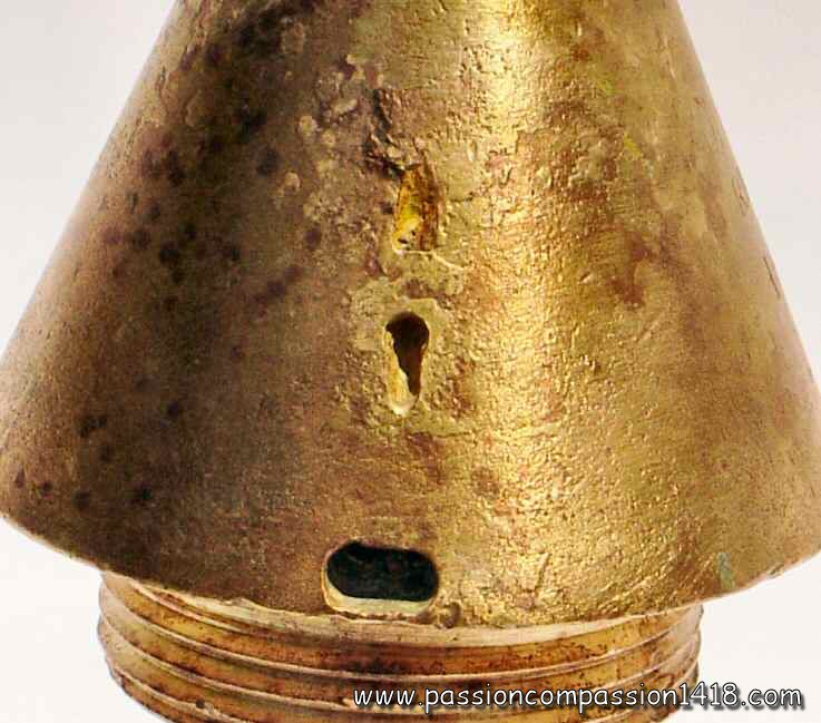 fuze GrZ 92. Detail showing the escape hole for the gasses created by the burning of the security gunpowder grain, ignited at the departure. This hole is still closed by the original thin brass sheet. |