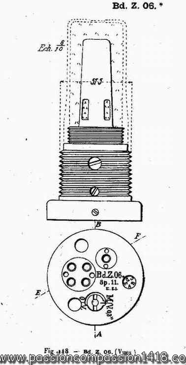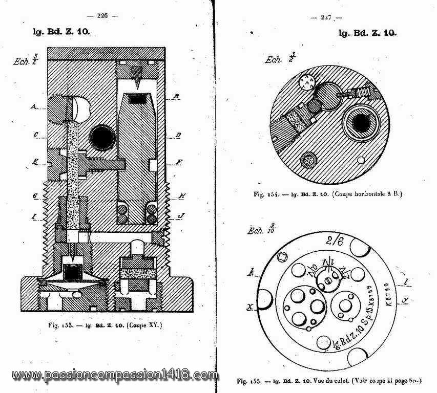 The Bd Z 10 fuze could be associated with two sizes of exploders : 100 gr or 25 gr picric acid. When assembled with a big 100 gr picric acid exploder it was often marked lg Bd Z 10 ('lg' = 'lang', refferring to the long exploder). It was then used with the high explosive shells of :