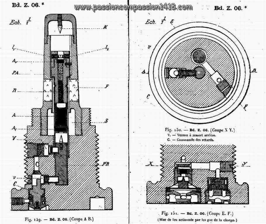 A fuze base gaz escape also existed linked to all the internal pyrotechnic devices, closed at rest by a compressed gunpowder pellet burnt by the gun departure hot gasses. In the case of a non-delayed behavior, the non-delayed system mobile graze pellet carrying the pin was liberated by positionning the bottom selector on the 'o/V' mark (allowing the flame of the diaphragm arming system to burn a gunpowder pellet blocking a lock). At the arrival on the target, the top (delayed) percussion system was triggered by having the mobile graze pellet primer hitting the static percussion pin, while the rear (non-delayed) mobile graze pellet percussion pin went forward to hit the rear primer. This latter instantaneously ignited the detonator charge. In the case of a delayed function, the non-delayed system mobile graze pellet carrying the pin was kept static by positionning the bottom selector on the 'm/V' (preventing the lock gunpowder to burn). At the arrival on the target, only the top (delayed) percussion system was triggered by having the mobile graze pellet primer hitting the static percussion pin. This set fire to the delay channel, 0.3 seconds before bursting the detonator. This fuze also integrated a detonator safety system. The detonator located in the mobile graze pellet was positionned at rest in an isolated detonation room, not communicating with the fuze outside. On the contrary, when the mobile graze pellet was projected onwards, this positioned the detonator in front of windows communicating with the exploder (unknown charge) in wich the fuze tail was inserted. The Bd Z 06 fuze was used with the high explosive shells of the :