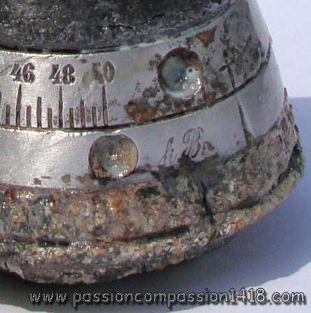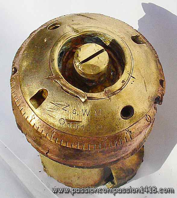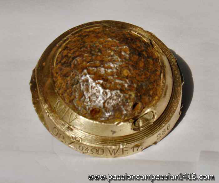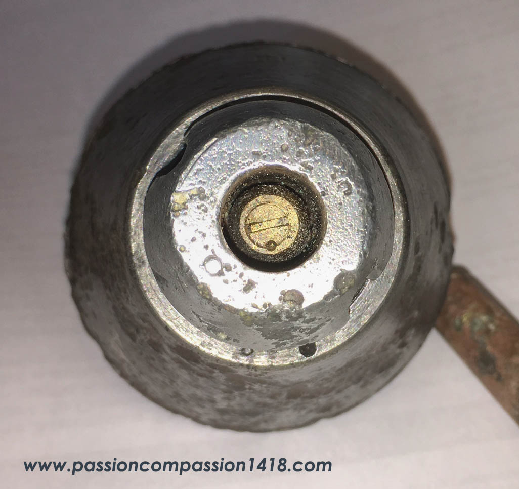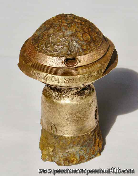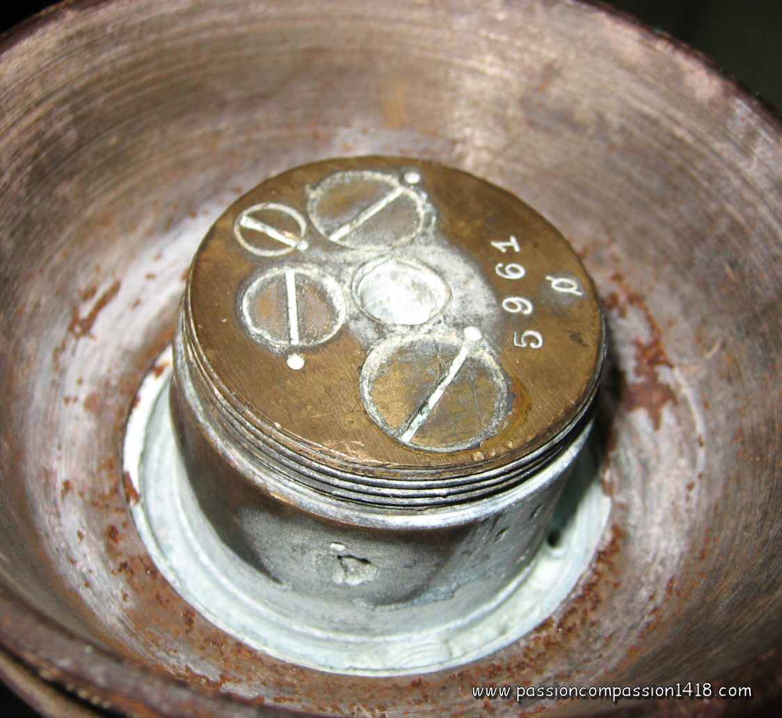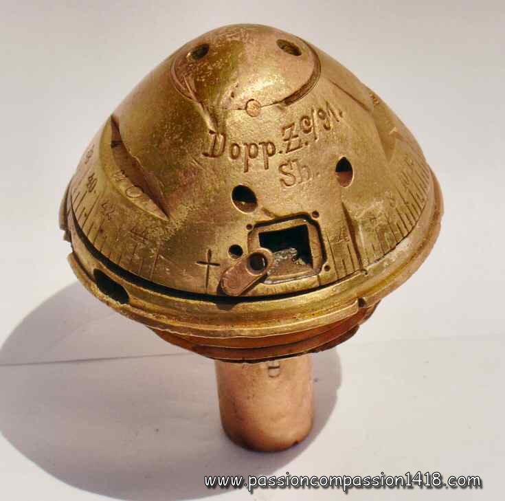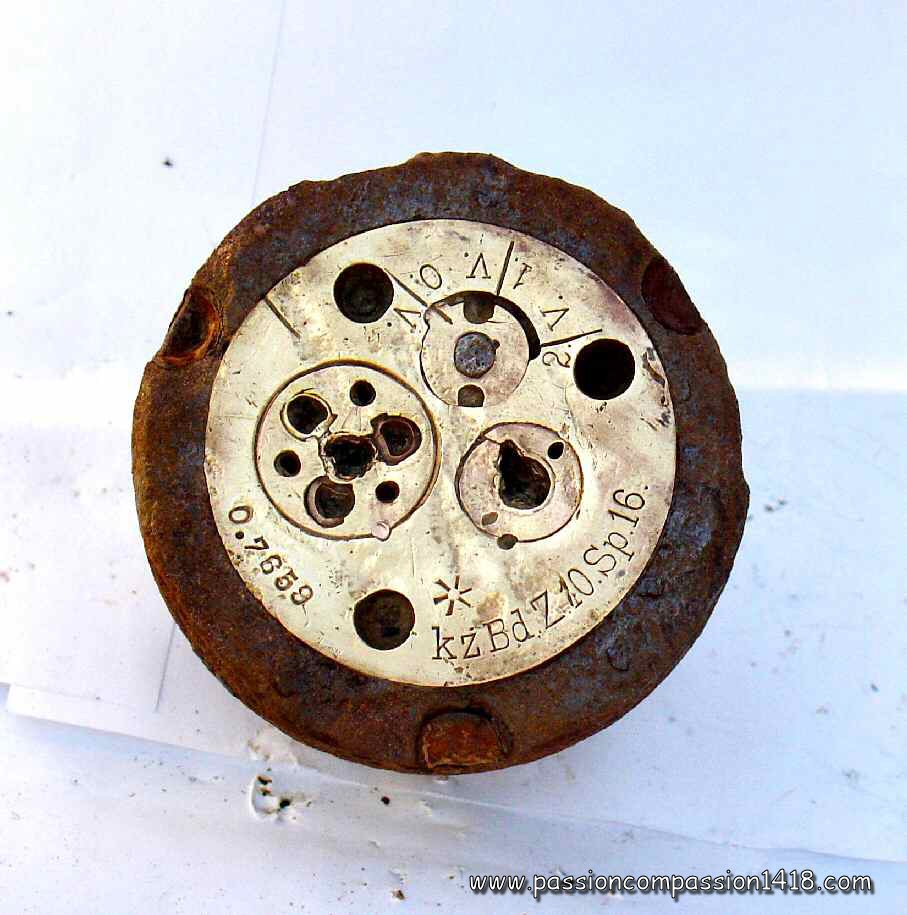 Top view of fuze GrZ 96/04 observed in Champagne. Markings 'Sb 10 - O 8979', manufactured in Strasburg in 1910. |