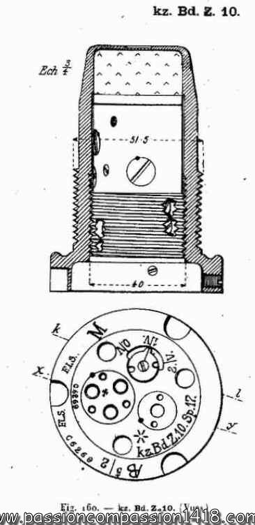 Although externally pretty similar to the Bd Z 06 fuze from 1906, the 1910 Bd Z 10 fuze was an complete re-design of the internals. In the new fuze, the complex twin percussion apparels systems has been replaced by a single non delayed percussion system linked to the detonator via three selectable channels for a non delay, small delay or long delay behavior)