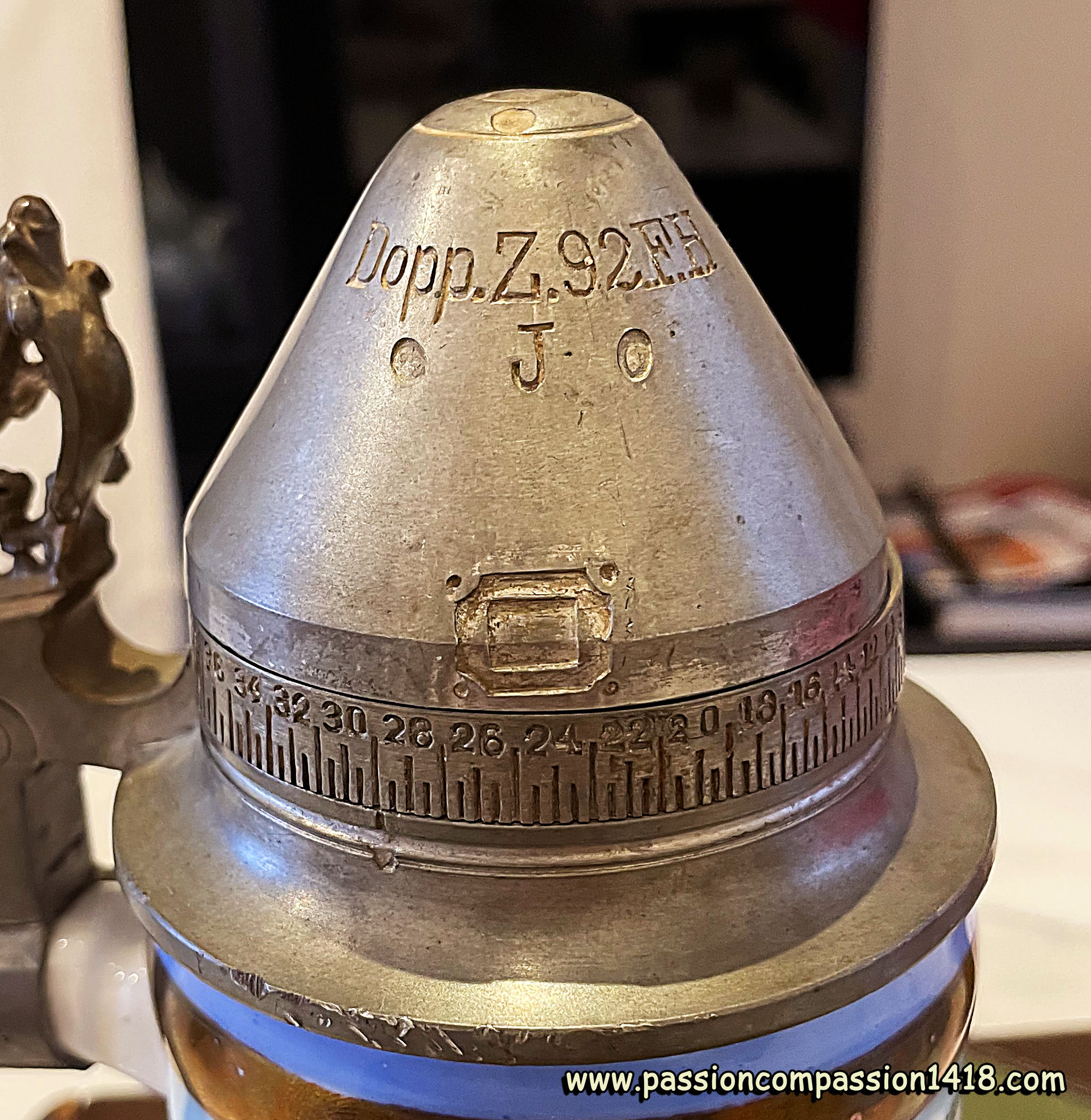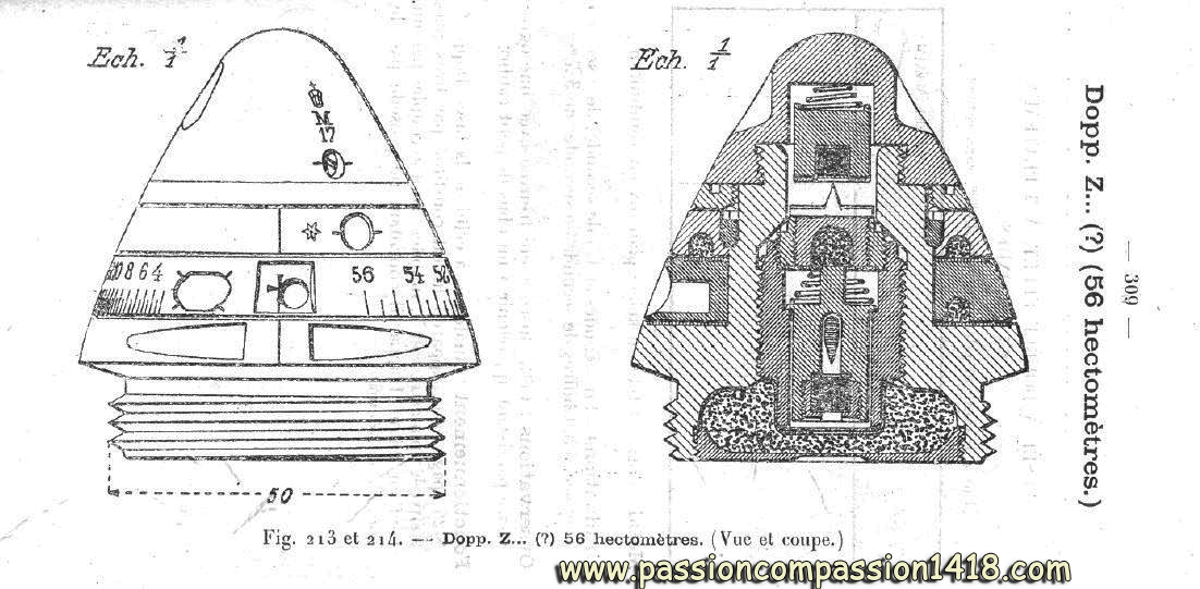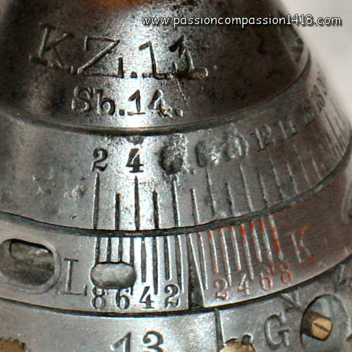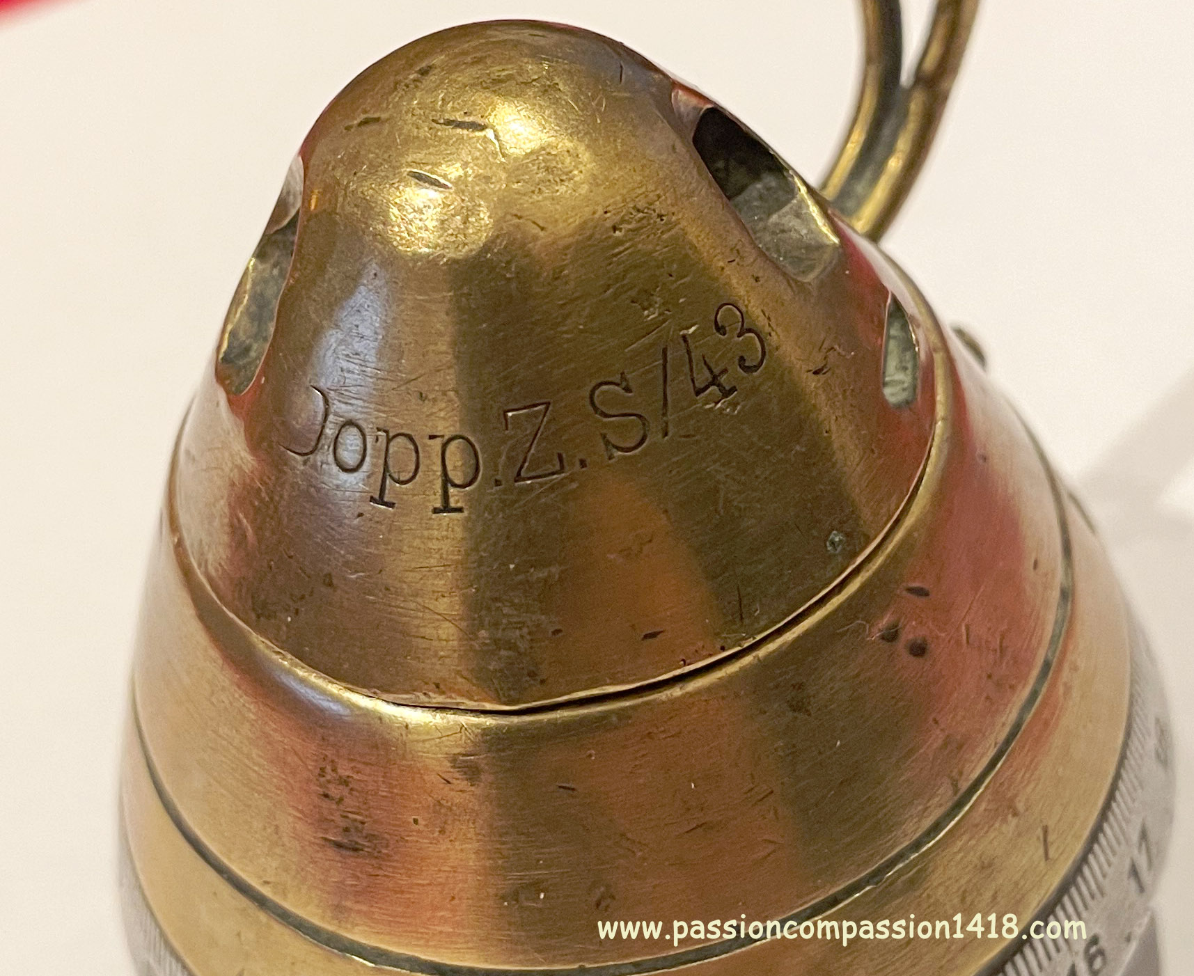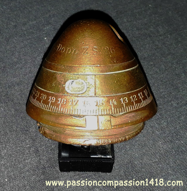 Very little information can be found for it, for sure a clue indicating its use was not frequent. As it is a Krupp made fuze internal Krupp designation would be "Dopp.Z. 56 hm" but these Krupp designations are rarely seen in any documents. Some wartime allied intelligence documents are naming it "Dopp Z ? (56)" without any official identification marking, and interprete the 0 to 56 graduation marks as seconds. This is a mistake that has been demonstrated by one of this website's contribuor Stefan Wagner. The scale of the time ring is graduated in hectometers (numbers) and half hectometers (line) Hectometer scales can be easily distinguished from time scales. Time scales are constant/linear: The distance from one second to the next one the ring always equals, as the combustion speed of the gunpowder track is constant. Distance scales are logarithmic because the projectile slows down on it's travel. The first hectometers on the ring have a small distance the last hectometers have a much larger distance on the scale. The Dopp Z 56 fuze mainly equipped the high explosive shells of the :