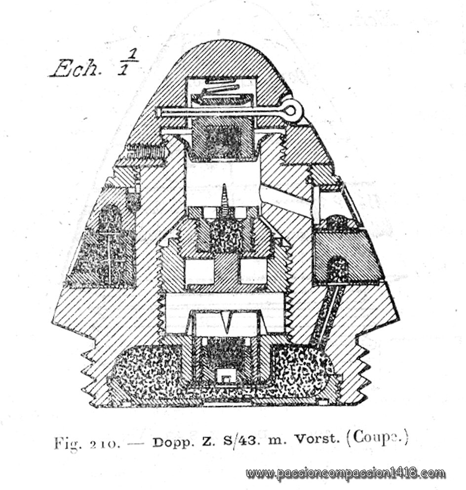 The Gr Z 96/04 fuze was a percussion graze fuze with optionnal delay, built around two parallel graze action percussion systems located in the tail. These two apparatus were practically identical, designed on a cylindrical graze pellet bearing a starter and a static percussion pin transverse bridge, but for the presence of a compressed gunpowder acting as a delay in the flame communication channel from the delayed percussion system to the detonator. The behaviour was selectable by the rotation of a setting stud commanding a vertical inner rod that deviated the flame to the adequate system. Depending on the selection it was positioned on 'oV' position (Ohne Verzögerung - without delay - let both systems activated) or on 'mV' position (mit Verzögerung - with delay - deactivating the undelayed percussion system). The arming system was secured at rest by a two rods safety pin. It was based on a the 'Dopp Z 92' fuze design : an axial and massive mobile graze pellet bearing a starter, a percussion pin protected by a tulip spring cap, and compressed gunpowder pellet blocking the percussion system. In this specifice model, the graze action arming system commanded the combustion of two compressed gunpowder pellets, one for each percussion system, that liberated the movements of two stems blocking the two mobile pellets. Another interesting characteristic of this fuze was its additional safety system for the exploder, inherited from the older type fuze Gr Z 96. At rest, its primer was placed within an isolated detonation room in wich it could explode without communicating the energy to the surronding relay-charge. At firing time, the combustion of a compressed black powder grain was freeing its movements inside a brass tube so that the landing shock inertia could push it just in front of a windows communicating with the explosive load. That fuze was used with the high explosive shells ('Gr' = Granate - Explosive shell) of the :