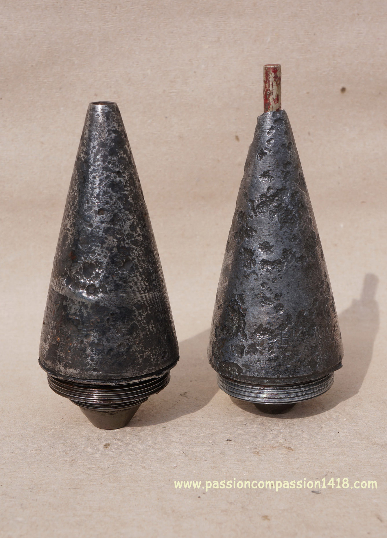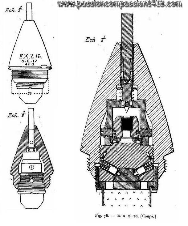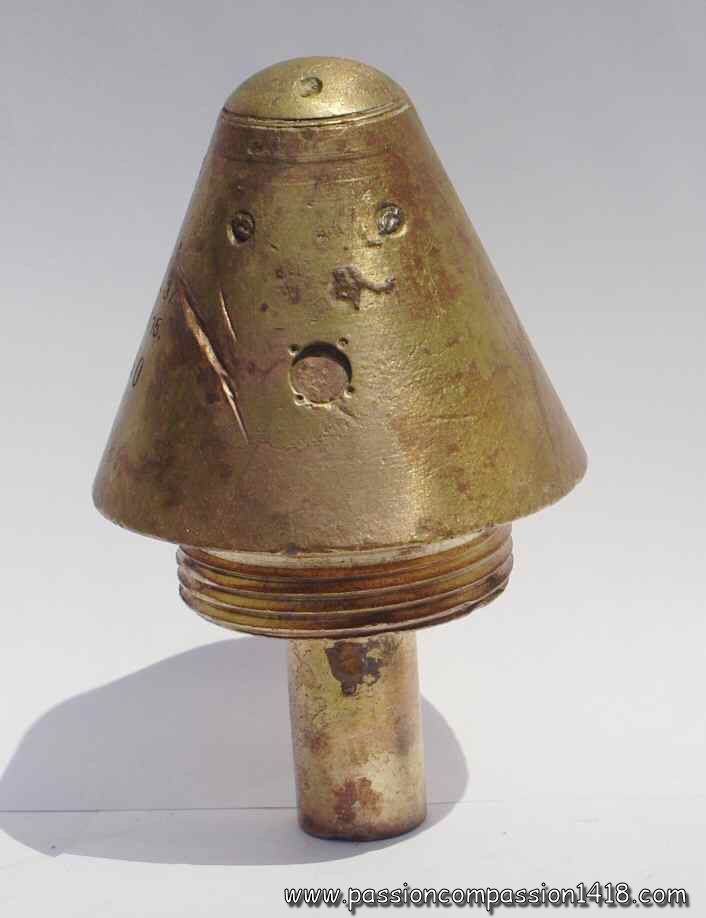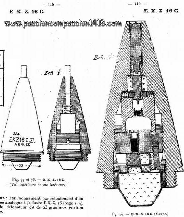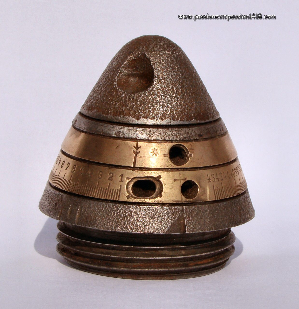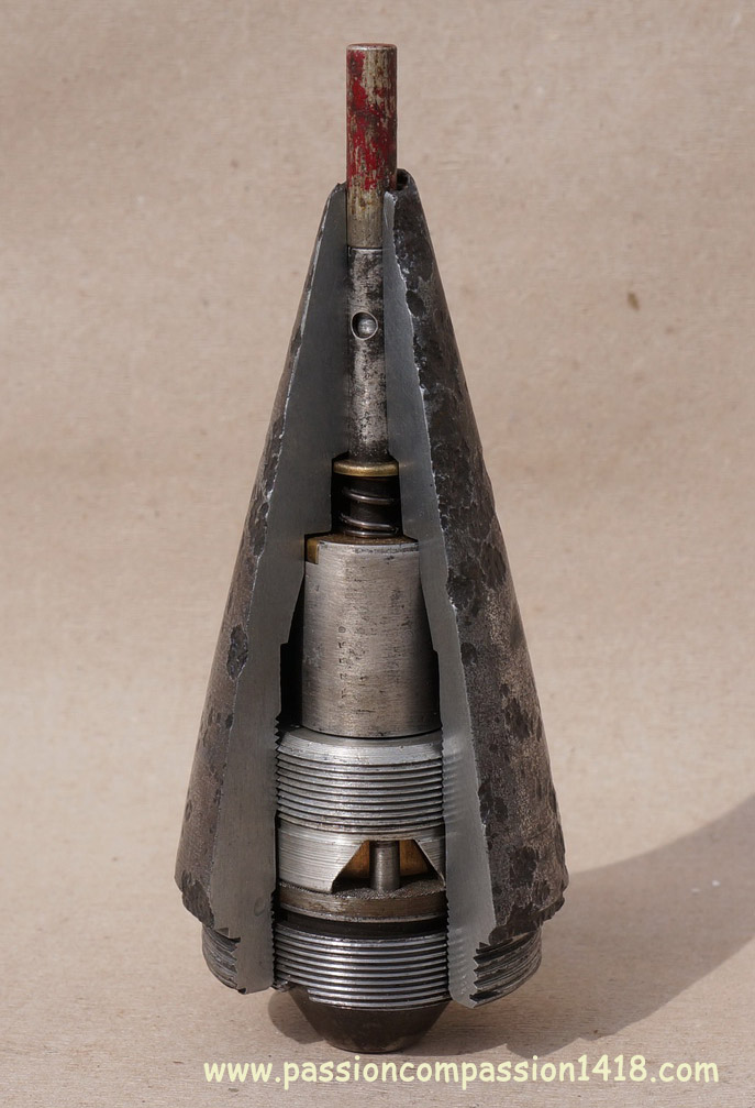 fuzes designed for high explosive shells had to be equipped with a powerful exploder (or 'gaine' - in German 'Zündladung'). Thes gaine were often screwed on the tail of the German fuzes, rather than mounted into the shell like for French ones. This characteristic is making those pieces very dangerous still nowadays, when the exploder is still present. The shells whose explosive did not need any exploder had to be equipped with specific fuzes.