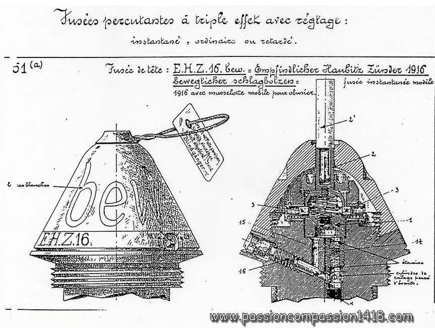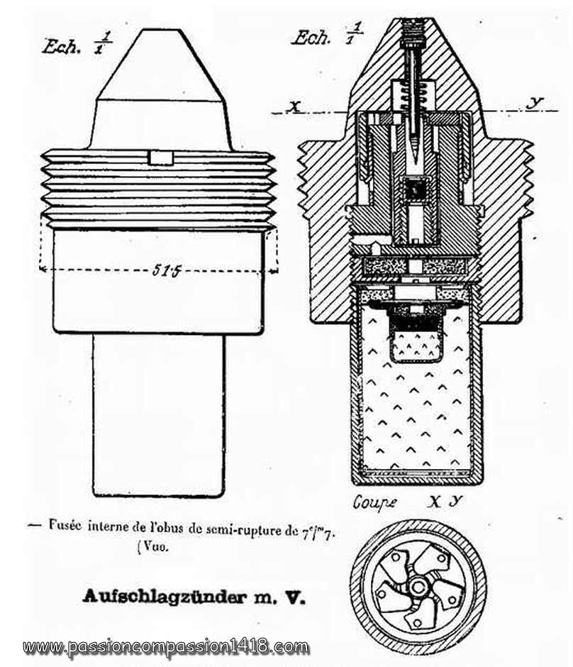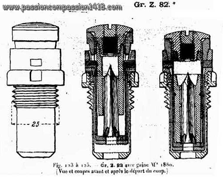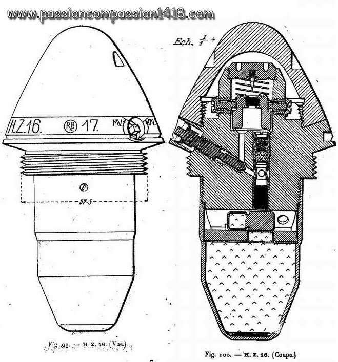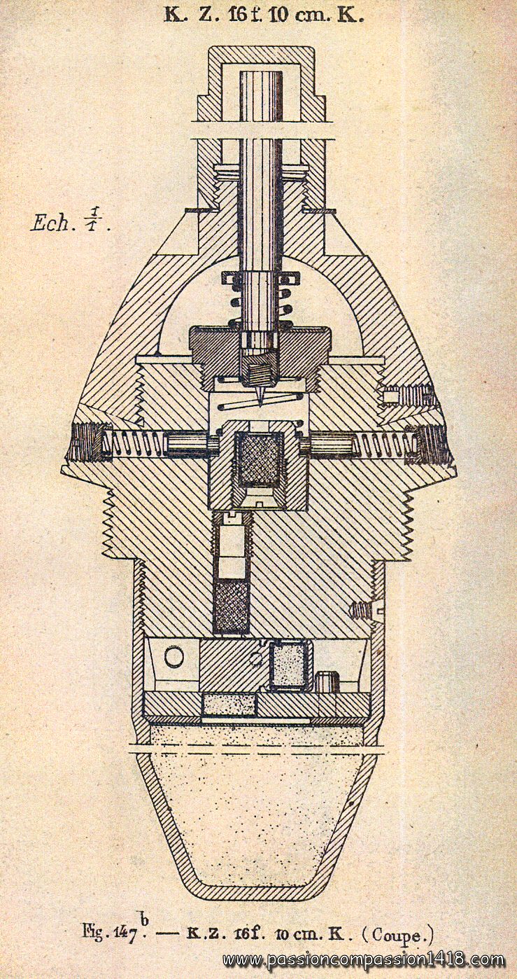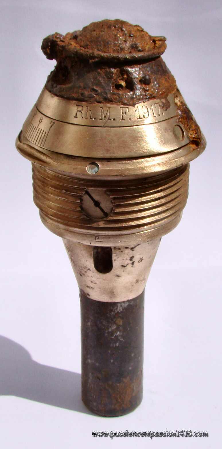 fuzes designed for high explosive shells had to be equipped with a powerful exploder (or 'gaine' - in German 'Zündladung'). Thes gaine were often screwed on the tail of the German fuzes, rather than mounted into the shell like for French ones. This characteristic is making those pieces very dangerous still nowadays, when the exploder is still present. The shells whose explosive did not need any exploder had to be equipped with specific fuzes.