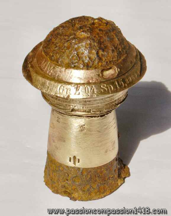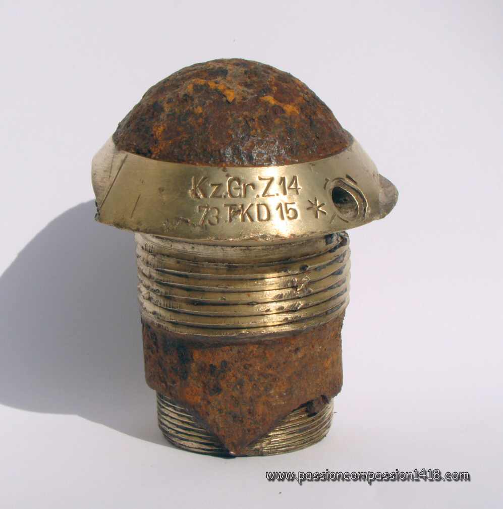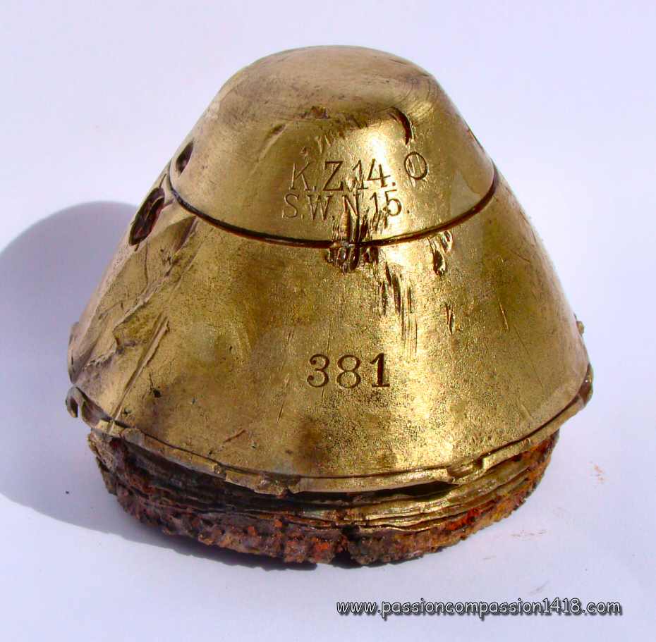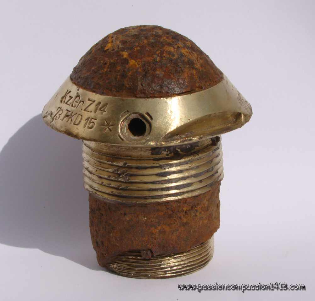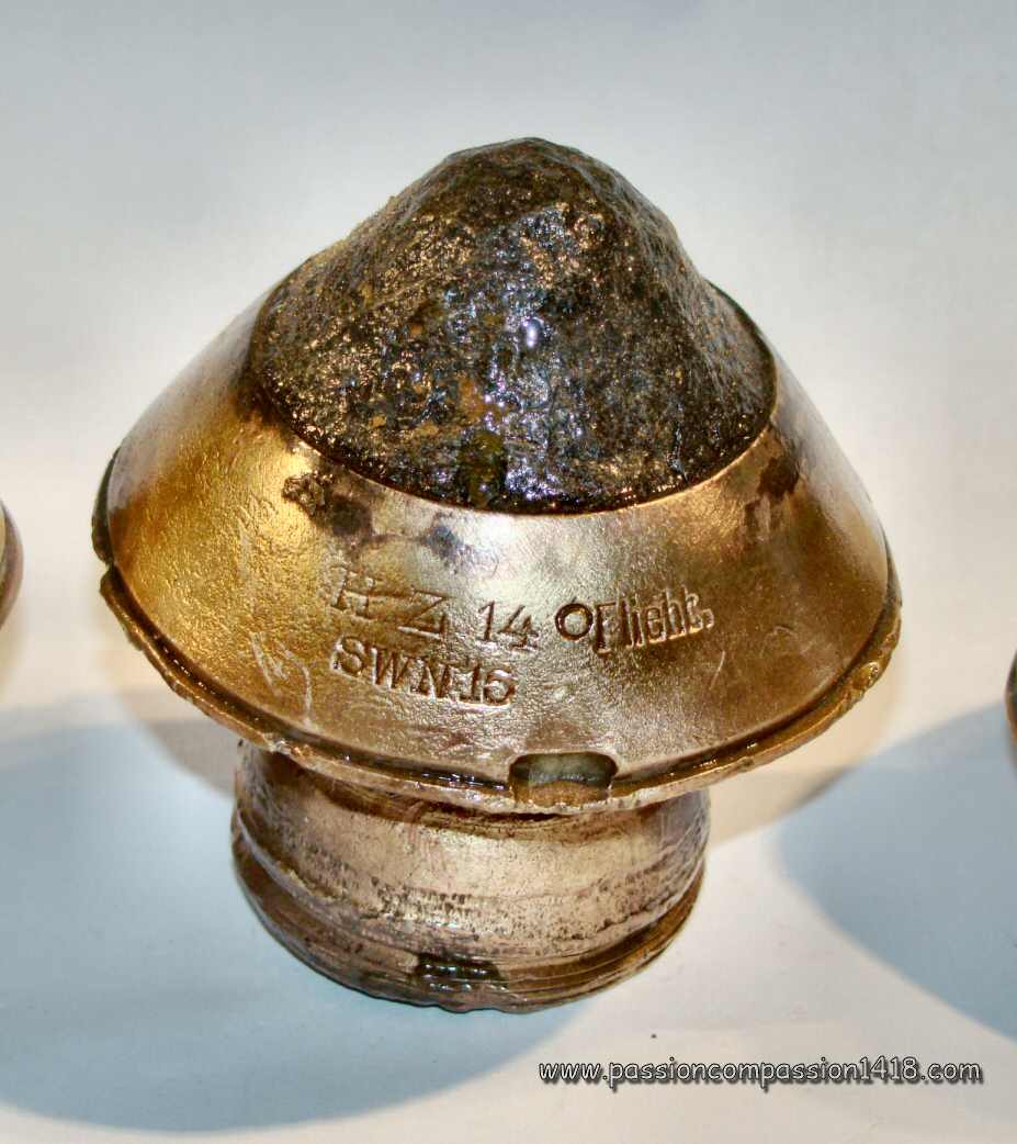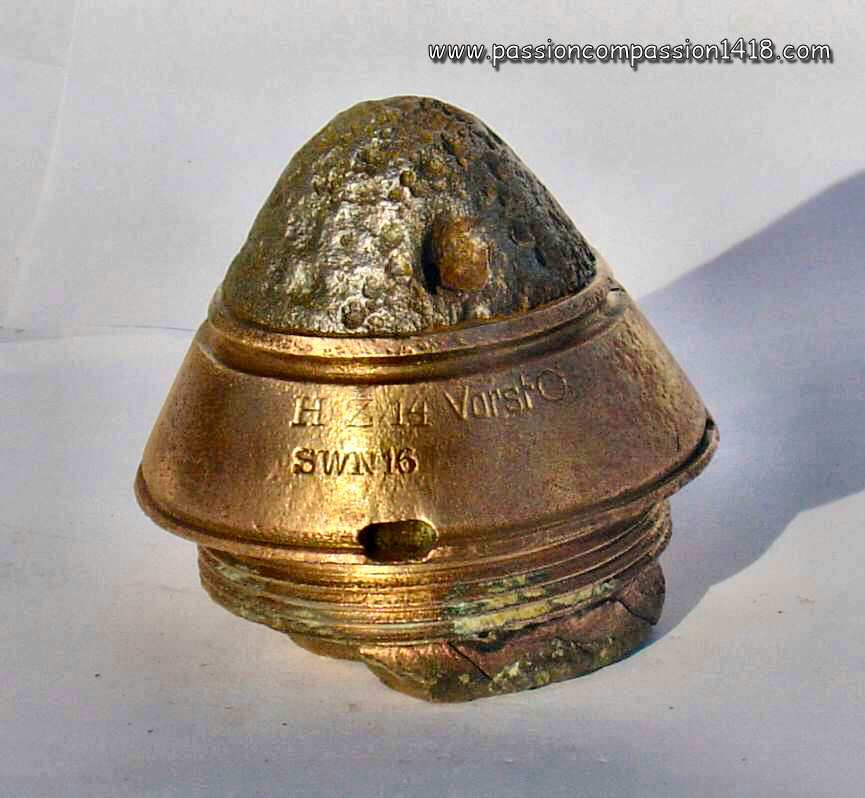 The graze action percussion fuzeKZ 14 used these two new systems without the KZ11 time system, and without any additional safety device. Simple and economic, it became the standard percussion fuze of the high explosive shell or gaz shell of the 7.7cm FK 96 n/A fielgun in 1914. Numerous specimens can still be observed nowadays in the former battlefields, but in various corroded conditions, depending on the material they are made of. Indeed, even if the earlier productions were entirely made in brass, the allies blocus on Germany effect on noble metals availability induced the progressive use of less noble materials such as zinc, aluminium or steel. Numerous combinations of thes materials were used for the fuze body or cap. It seems the use of these alternative materials were sometimes shown on the fuze marking (KZ 14 Z, KZ 14 Zi, KZ 14 Zp, KZ 14 Zw or KZ 14 nA Zl). Equipped from the factory with a crimped 20 to 22 gr picric acid exploder, it was mounted on the high explosive shells and gaz shells (green cross) of the