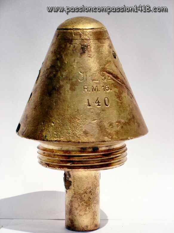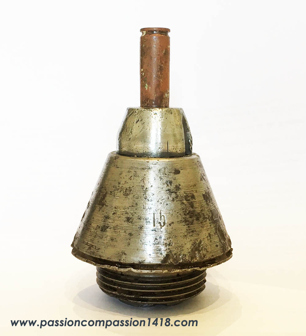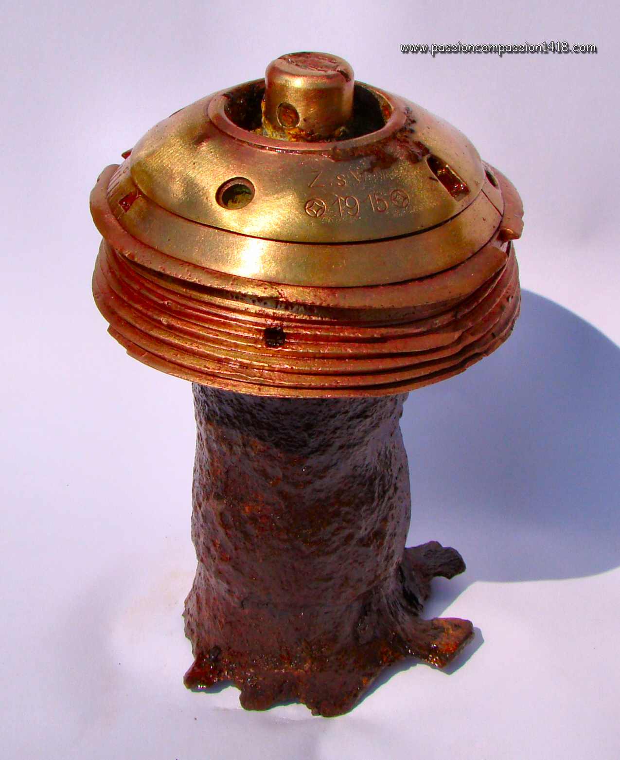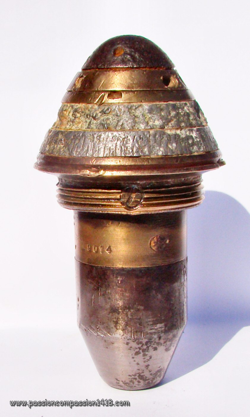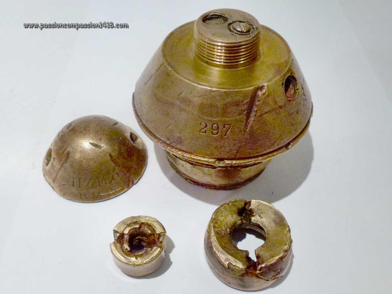 The graze action percussion fuzeKZ 14 used these two new systems without the KZ11 time system, and without any additional safety device. Simple and economic, it became the standard percussion fuze of the high explosive shell or gaz shell of the 7.7cm FK 96 n/A fielgun in 1914. Numerous specimens can still be observed nowadays in the former battlefields, but in various corroded conditions, depending on the material they are made of. Indeed, even if the earlier productions were entirely made in brass, the allies blocus on Germany effect on noble metals availability induced the progressive use of less noble materials such as zinc, aluminium or steel. Numerous combinations of thes materials were used for the fuze body or cap. It seems the use of these alternative materials were sometimes shown on the fuze marking (KZ 14 Z, KZ 14 Zi, KZ 14 Zp, KZ 14 Zw or KZ 14 nA Zl). Equipped from the factory with a crimped 20 to 22 gr picric acid exploder, it was mounted on the high explosive shells and gaz shells (green cross) of the