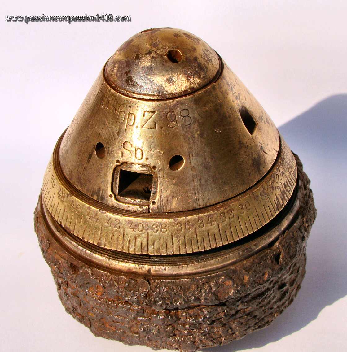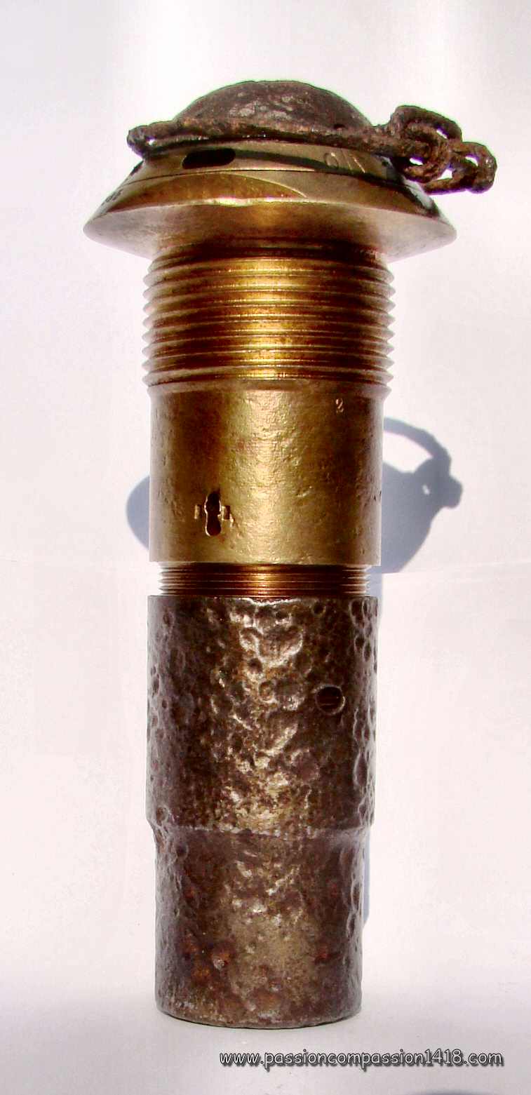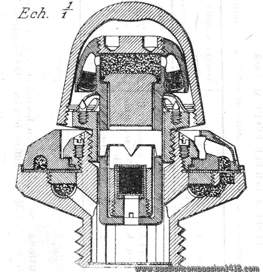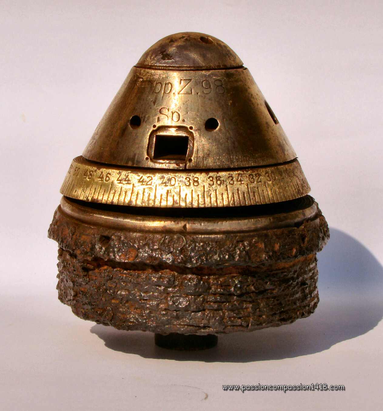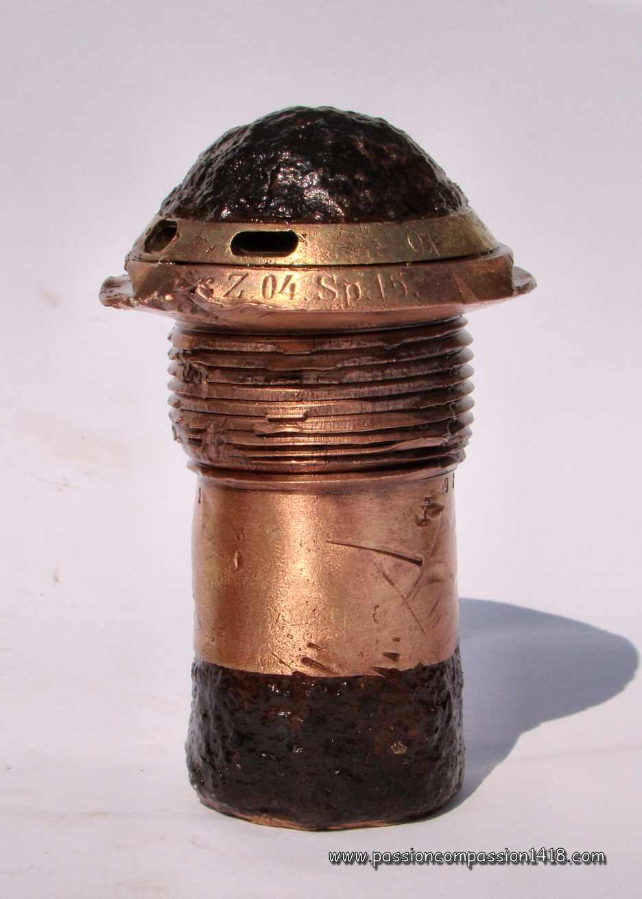 The graze action percussion fuzeKZ 14 used these two new systems without the KZ11 time system, and without any additional safety device. Simple and economic, it became the standard percussion fuze of the high explosive shell or gaz shell of the 7.7cm FK 96 n/A fielgun in 1914. Numerous specimens can still be observed nowadays in the former battlefields, but in various corroded conditions, depending on the material they are made of. Indeed, even if the earlier productions were entirely made in brass, the allies blocus on Germany effect on noble metals availability induced the progressive use of less noble materials such as zinc, aluminium or steel. Numerous combinations of thes materials were used for the fuze body or cap. It seems the use of these alternative materials were sometimes shown on the fuze marking (KZ 14 Z, KZ 14 Zi, KZ 14 Zp, KZ 14 Zw or KZ 14 nA Zl). Equipped from the factory with a crimped 20 to 22 gr picric acid exploder, it was mounted on the high explosive shells and gaz shells (green cross) of the
