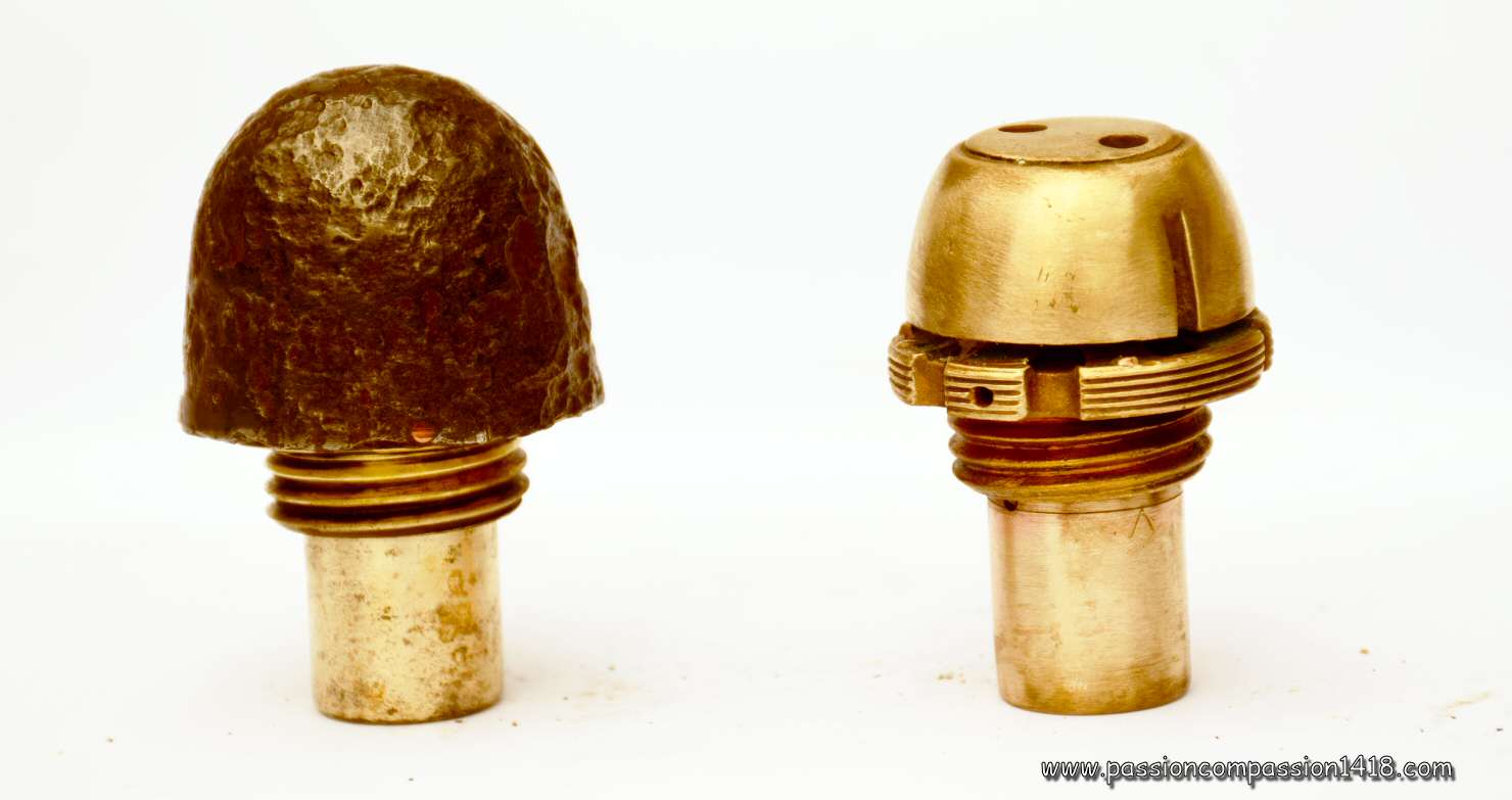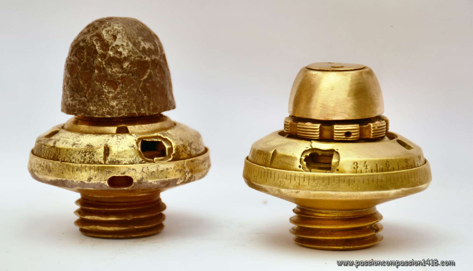 Fuze ZsumWM. Different materials (steel and brass) used for the head. Left fuze markings 'J 1916 J - Z.s.u.m.W.M. - 73'; right fuze 'Rh.M.M.1915 - P8826' |