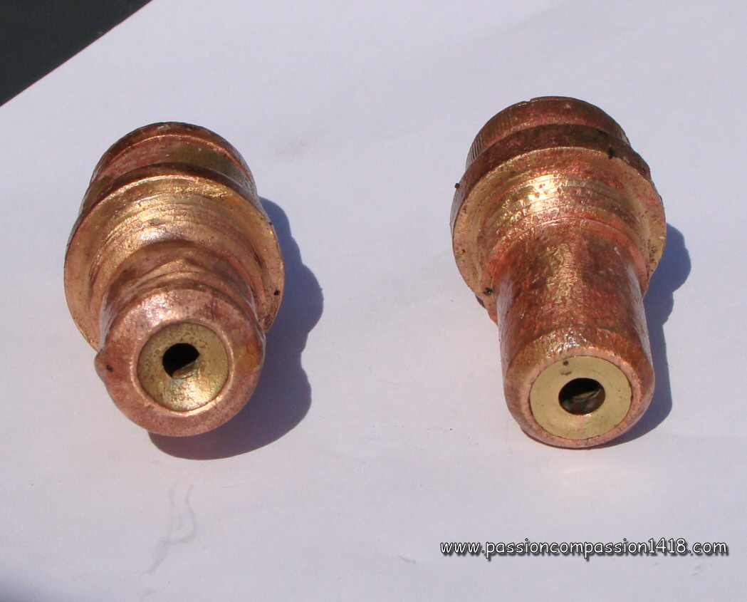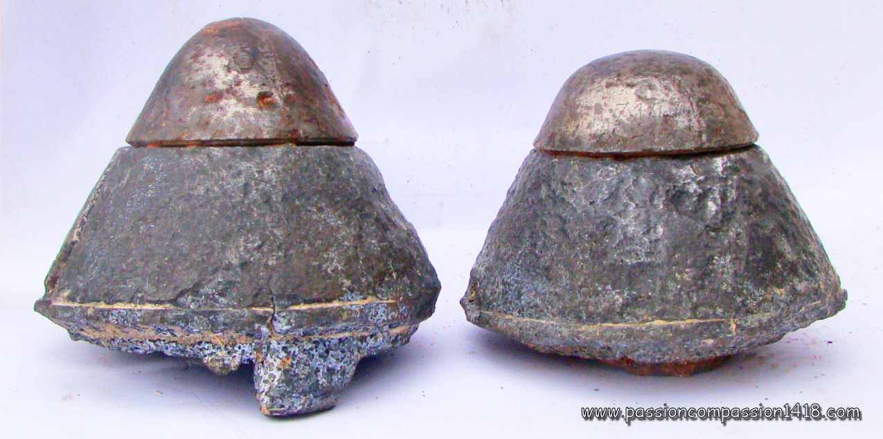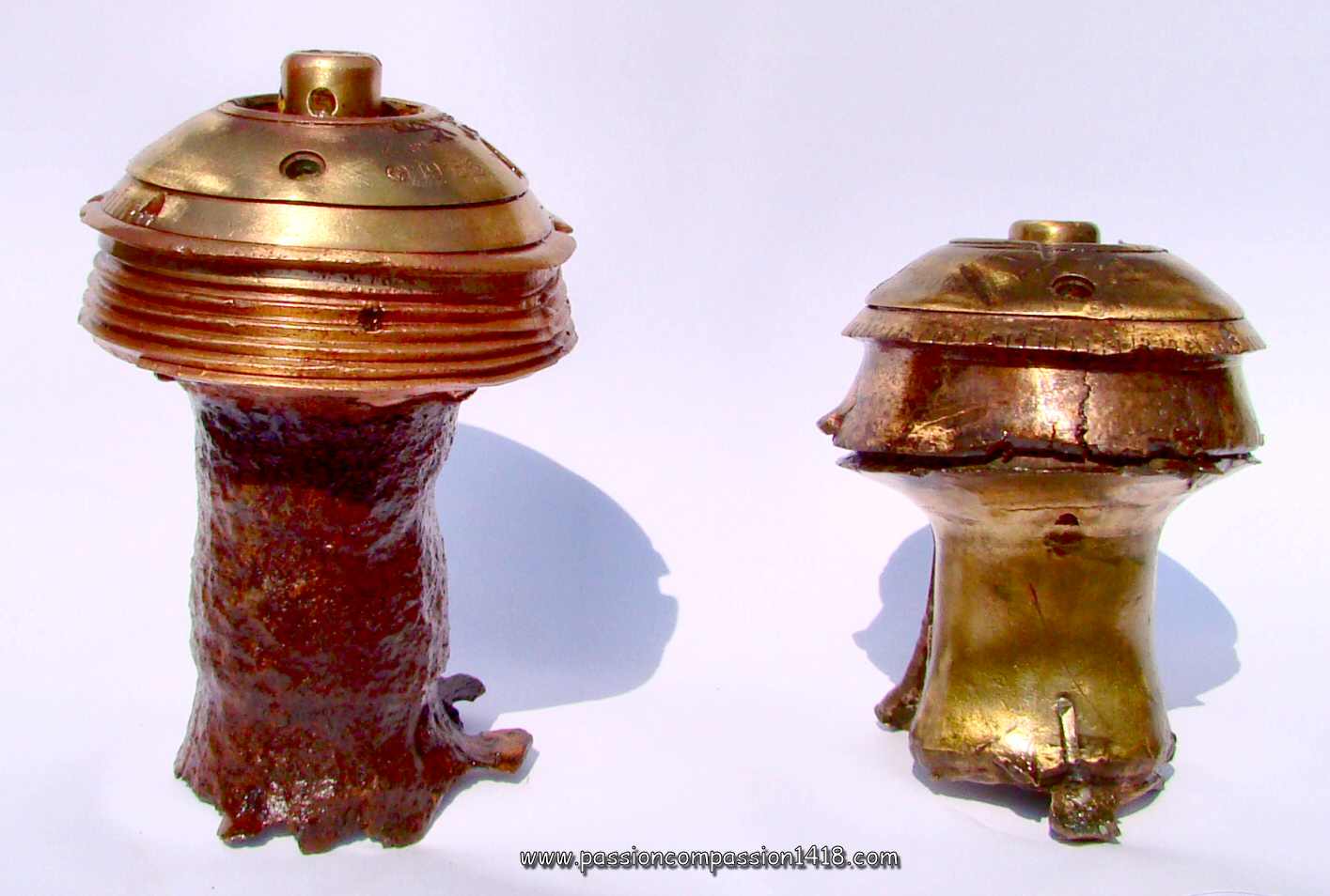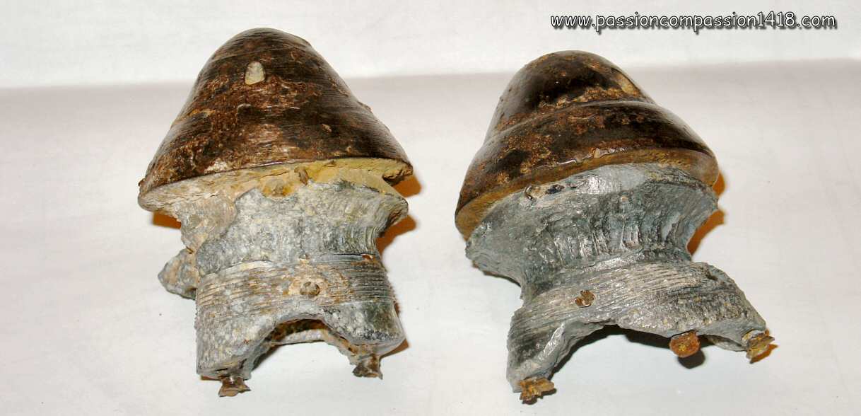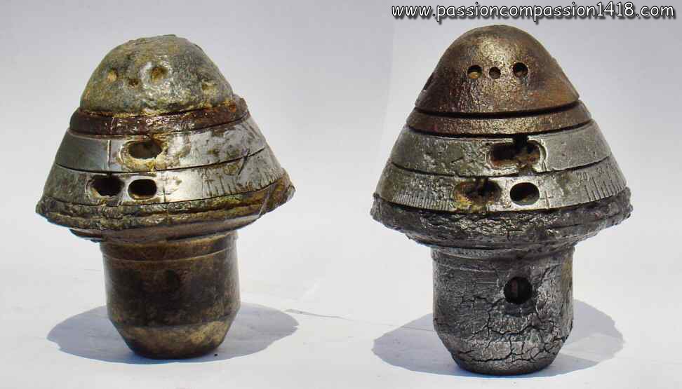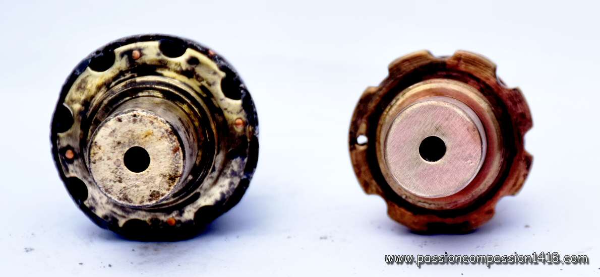 KZ 14 and KZ14 n/A fuzes. The specimen at the left side is a KZ14 n/A, that can be reckognized by the sharper profile of its upper cap |