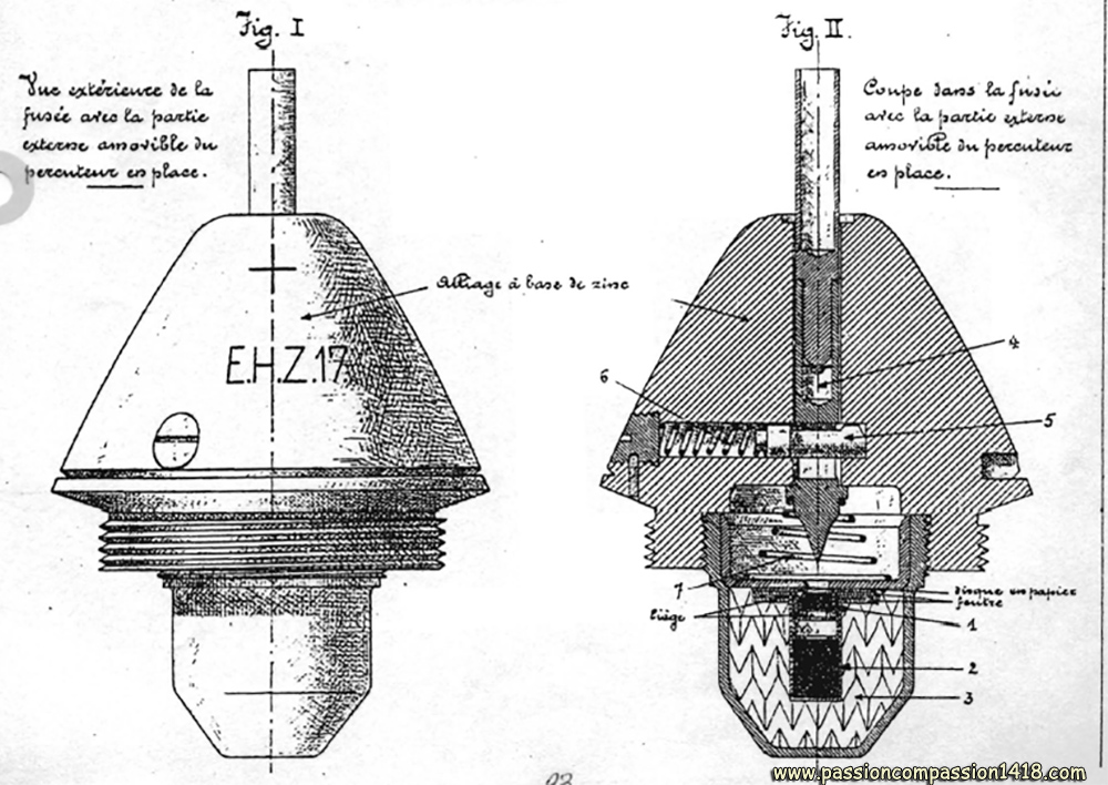 Since 1914, the German Army pionneers were given 175mm middle minenwerfers and 245mm heavy minenwerfers. A specific fuze was existing for each of the two models.