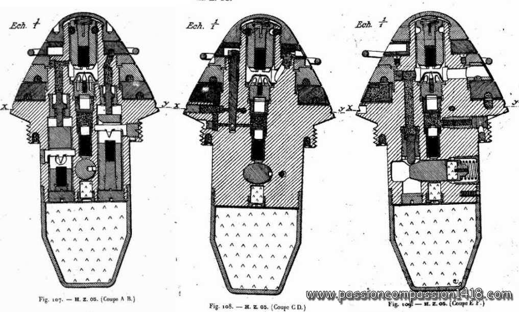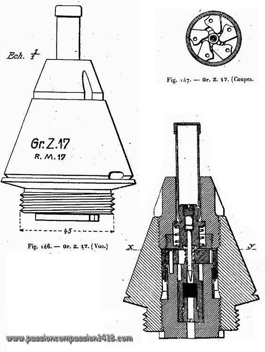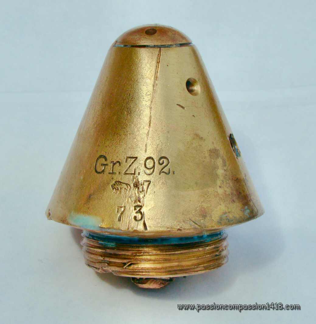 This fuze is in fact the percussion model designed for the heavy artillery high explosive shells, derivated from the new generation of 1914 German fuzes with a technology initially developped for the 'KZ 11' fuze, but also integratezd into the 'KZ 14' fuze for the field guns, and into the 'HZ 14' fuze for the field howitzers. The Gr Z 14 was made in brass with a steel cap and gaine, and had a 45 mm thread. Like the other fuzes from the same generation, it was based on a two components graze arming system (mobile graze pellet with starter, and gunpowder pellet stopping a safety stem that blocks the main percussion system), and a main graze percussion system (mobile graze pellet bearing the starter and static percussion pin, with safety spring and blocked by a safety stem). If the inner organization was totally different, it was functionnally only a simplification of the Gr Z 04 fuze, being a heavy caliber shell percussion fuze with no optional delay nor exploder safety system. It was equipped with single rod safety pin for the graze arming system. This fuze was used with numerous projectiles during the war. It was mounted on the high explosive shells, incendiary shells and gaz shells (green, yellow and blue cross) of the :