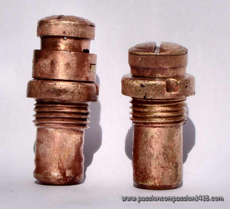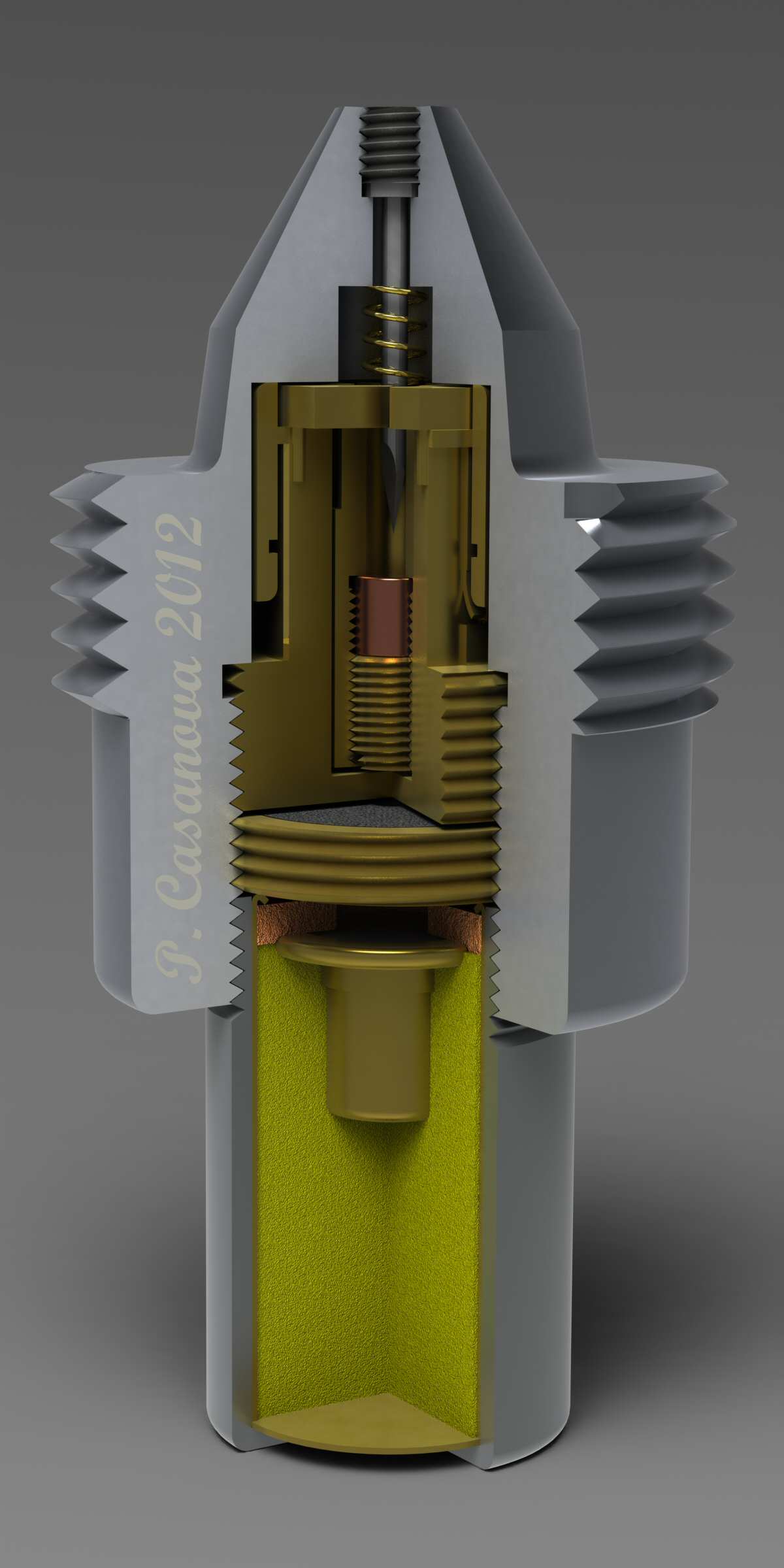 fuze GrZ 92. The head cap has disappeared, giving a view on the percussion pin pellet of the security system. On the side, view on the two safety pin holes, and opened gaz escape hole |
