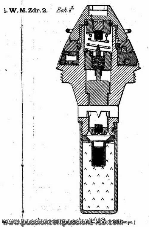 The first projectiles from the 25cm sMW a/A heavy minenwerfers were lauched against some of the Liège fortified position fortresses, with devastating results. The high explosive shells of this kind of weapon needed specific fuzes taking into account the small initial speeds (less than 100 m/s), and the uncertain landing conditions (on the shell top, base or side). Made in brasse (and sometimes with an aluminium head), the impressive 'Z.s.W.M.' - 'zünder für Schwerer Wurf-Minen' ('Fuze for heavy mine launchers') fuze was equipped with a graze action percussion system that would trigger whenever the shell felt on its nose or on its base, and a time system designed to explode the shell after some seconds if the percussion system had failed. The ZsWM fuze integrated :