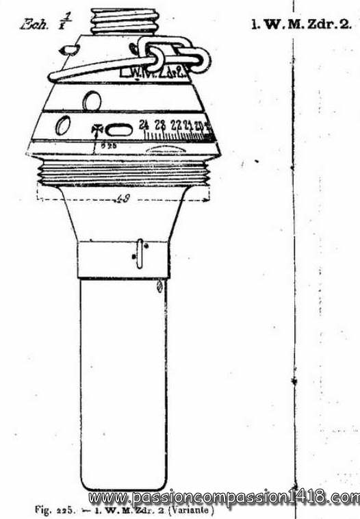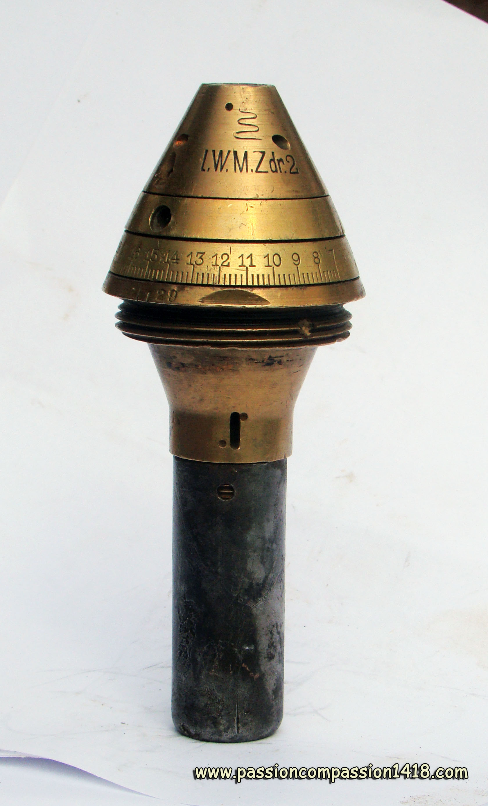 2 fuzes IWMZdr2 at the right side of one IWMZdr. No noticeable external differences. Markings identical for both the right side fuzes : 'Serpentine - L.W.M.Zdr.2 - losange - 1916 - losange' |